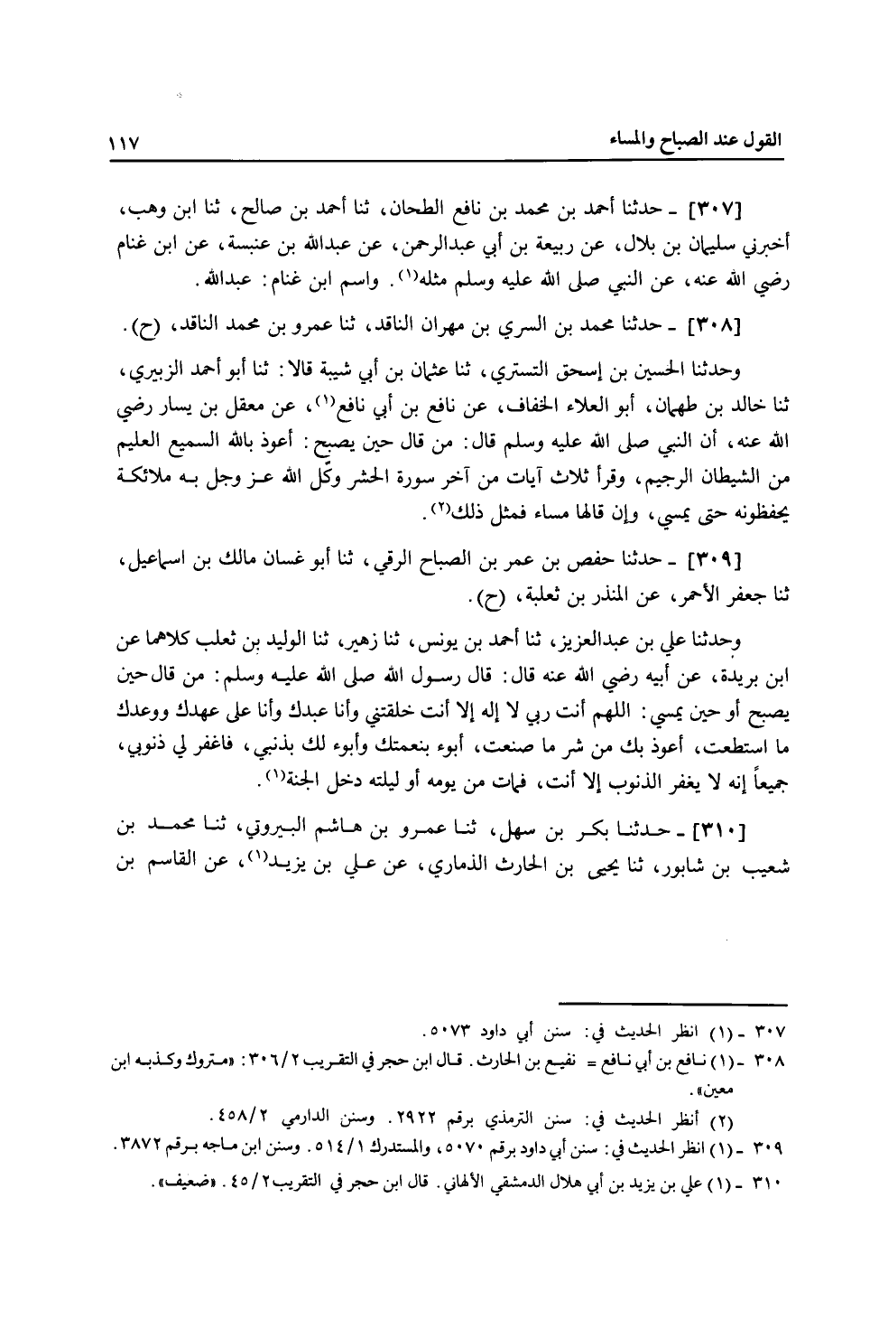 308 - حَدَّثَنَا مُحَمَّدُ بْنُ السَّرِيِّ بْنِ مِهْرَانَ النَّاقِدُ، ثنا عَمْرُو بْنُ مُحَمَّدٍ النَّاقِدُ، ح وَحَدَّثَنَا الْحُسَيْنُ بْنُ إِسْحَاقَ التُّسْتَرِيُّ، ثنا عُثْمَانُ بْنُ أَبِي شَيْبَةَ، قَالَا: ثنا أَبُو أَحْمَدَ الزُّبَيْرِيُّ، ثنا خَالِدُ بْنُ طَهْمَانَ أَبُو الْعَلَاءِ الْخَفَّافُ، عَنْ نَافِعِ بْنِ أَبِي نَافِعٍ، عَنْ مَعْقِلِ بْنِ يَسَارٍ، رَضِيَ اللَّهُ عَنْهُ أَنَّ النَّبِيَّ صَلَّى اللهُ عَلَيْهِ وَسَلَّمَ قَالَ: " §مَنْ قَالَ حِينَ يُصْبِحُ: أَعُوذُ بِاللَّهِ السَّمِيعِ الْعَلِيمِ مِنَ الشَّيْطَانِ الرَّجِيمِ وَقَرَأَ ثَلَاثَ آيَاتٍ مِنْ آخِرِ سُورَةِ الْحَشْرِ وَكَّلَ اللَّهُ عَزَّ وَجَلَّ بِهِ مَلَائِكَةً يَحْفَظُونَهُ حَتَّى يُمْسِيَ، وَإِنْ قَالَهَا مَسَاءً فَمِثْلُ ذَلِكَ "