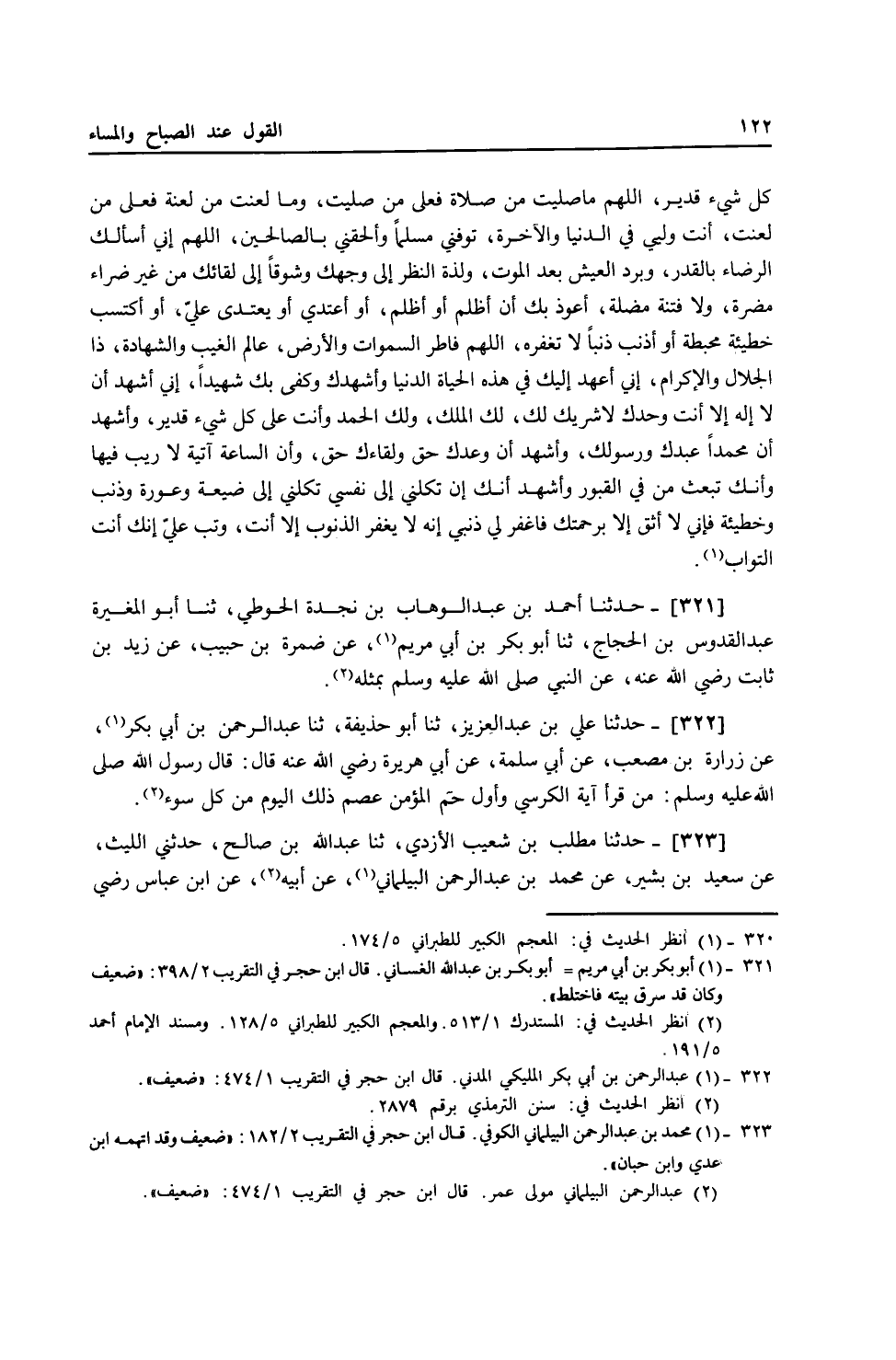 323 - حَدَّثَنَا مُطَّلِبُ بْنُ شُعَيْبٍ الْأَزْدِيُّ، ثنا عَبْدُ اللَّهِ بْنُ صَالِحٍ، حَدَّثَنِي اللَّيْثُ، عَنْ سَعِيدِ بْنِ بَشِيرٍ، عَنْ مُحَمَّدِ بْنِ عَبْدِ الرَّحْمَنِ الْبَيْلَمَانِيِّ، عَنْ أَبِيهِ، عَنِ ابْنِ عَبَّاسٍ، رَضِيَ اللَّهُ عَنْهُ عَنِ النَّبِيِّ صَلَّى اللهُ عَلَيْهِ وَسَلَّمَ قَالَ: " §مَنْ قَالَ حِينَ يُصْبِحُ: {فَسُبْحَانَ اللَّهِ حِينَ تُمْسُونَ وَحِينَ تُصْبِحُونَ} [الروم: 17] إِلَى {وَكَذَلِكَ تُخْرَجُونَ} [الروم: 19] أَدْرَكَ مَا فَاتَهُ مِنْ يَوْمِهِ، وَمَنْ قَالَهَا حِينَ يُمْسِي أَدْرَكَ مَا فَاتَهُ فِي لَيْلَتِهِ "