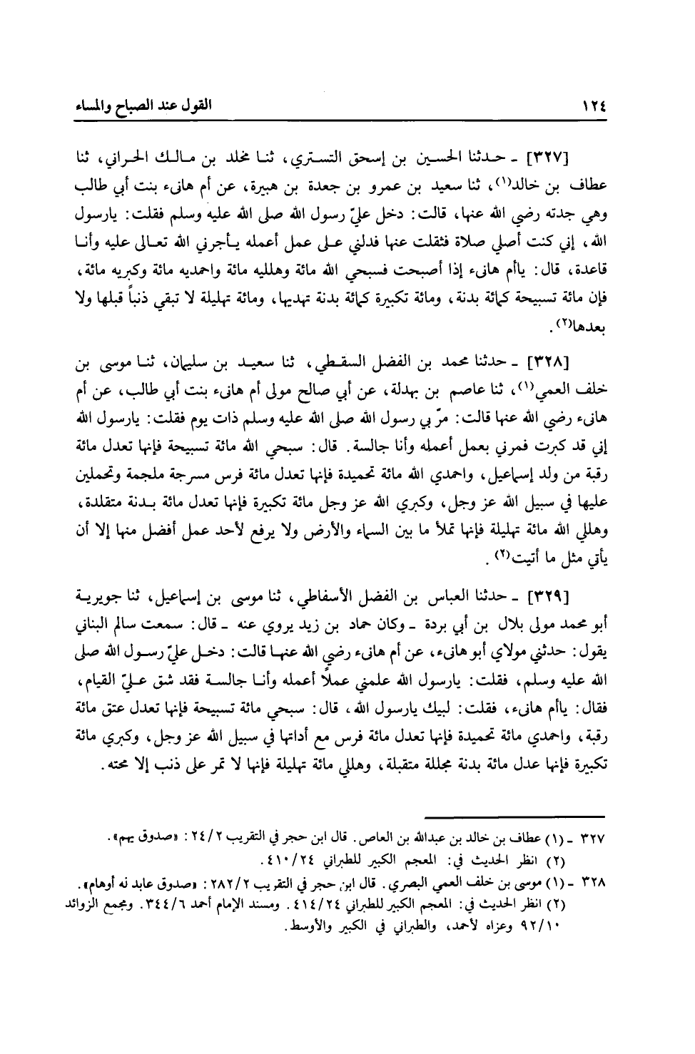 327 - حَدَّثَنَا الْحُسَيْنُ بْنُ إِسْحَاقَ التُّسْتَرِيُّ، ثنا مَخْلَدُ بْنُ مَالِكٍ الْحَرَّانِيُّ، ثنا عَطَّافُ بْنُ خَالِدٍ، ثنا سَعِيدُ بْنُ عَمْرِو بْنِ جَعْدَةَ بْنِ هُبَيْرَةَ، عَنْ أُمِّ هَانِئٍ بِنْتِ أَبِي طَالِبٍ، وَهِيَ جَدَّتُهُ رَضِيَ اللَّهُ عَنْهَا قَالَتْ: دَخَلَ عَلَيَّ رَسُولُ اللَّهِ صَلَّى اللهُ عَلَيْهِ وَسَلَّمَ فَقُلْتُ: يَا رَسُولَ اللَّهِ، إِنِّي كُنْتُ أُصَلِّي صَلَاةً فَثَقُلْتُ عَنْهَا، فَدُلَّنِي عَلَى عَمَلٍ أَعْمَلُهُ يَأْجُرُنِي اللَّهُ تَعَالَى عَلَيْهِ وَأَنَا قَاعِدَةٌ، قَالَ: «يَا أُمَّ هَانِئٍ، §إِذَا أَصْبَحْتِ فَسَبِّحِي اللَّهَ مِائَةً، وَهَلِّلِيهِ مِائَةً، وَاحْمَدِيهِ مِائَةً، وَكَبِّرِيهِ مِائَةً، فَإِنَّ مِائَةَ تَسْبِيحَةٍ كَمِائَةِ بَدَنَةٍ، وَمِائَةُ تَكْبِيرَةٍ كَمِائَةِ بَدَنَةٍ تُهْدِيهَا، وَمِائَةُ تَهْلِيلَةٍ لَا تُبْقِي ذَنْبًا قَبْلَهَا وَلَا بَعْدَهَا»