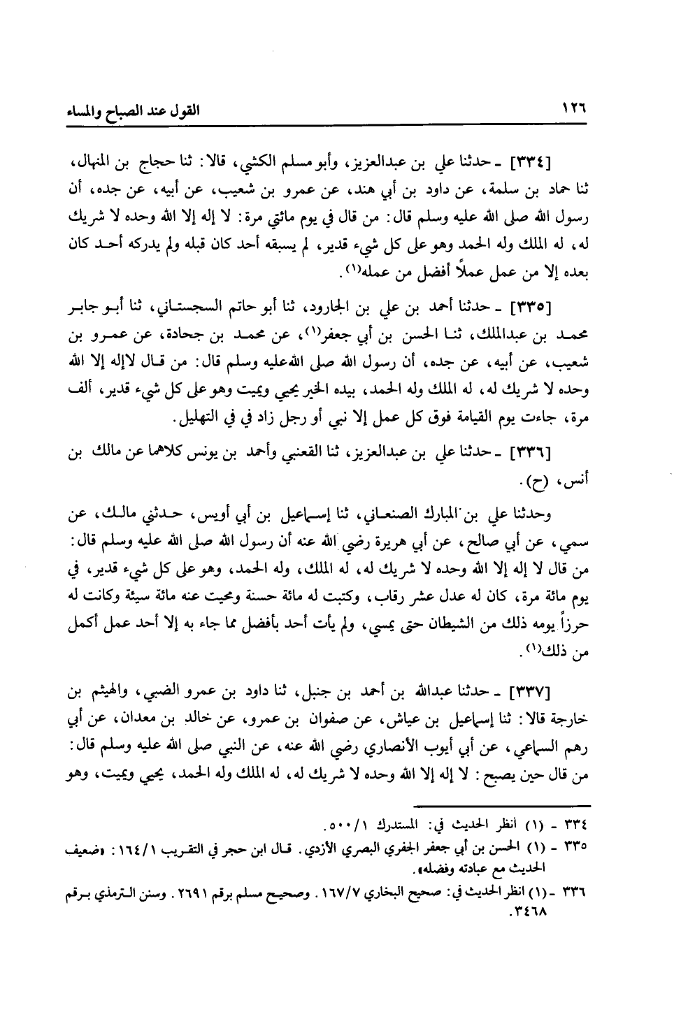 334 - حَدَّثَنَا عَلِيُّ بْنُ عَبْدِ الْعَزِيزِ، وَأَبُو مُسْلِمٍ الْكَشِّيُّ قَالَا: ثنا حَجَّاجُ بْنُ الْمِنْهَالِ، ثنا حَمَّادُ بْنُ سَلَمَةَ، عَنْ دَاوُدَ بْنِ أَبِي هِنْدٍ، عَنْ عَمْرِو بْنِ شُعَيْبٍ، عَنْ أَبِيهِ، عَنْ جَدِّهِ، أَنَّ رَسُولَ اللَّهِ صَلَّى اللهُ عَلَيْهِ وَسَلَّمَ قَالَ: «§مَنْ قَالَ فِي يَوْمٍ مِائَتَيْ مَرَّةٍ لَا إِلَهَ إِلَّا اللَّهُ وَحْدَهُ لَا شَرِيكَ لَهُ، لَهُ الْمُلْكُ وَلَهُ الْحَمْدُ وَهُوَ عَلَى كُلِّ شَيْءٍ قَدِيرٌ لَمْ يَسْبِقْهُ أَحَدٌ كَانَ قَبْلَهُ، وَلَمْ يُدْرِكْهُ أَحَدٌ كَانَ بَعْدَهُ إِلَّا مَنْ عَمِلَ عَمَلًا أَفْضَلَ مِنْ عَمَلِهِ»