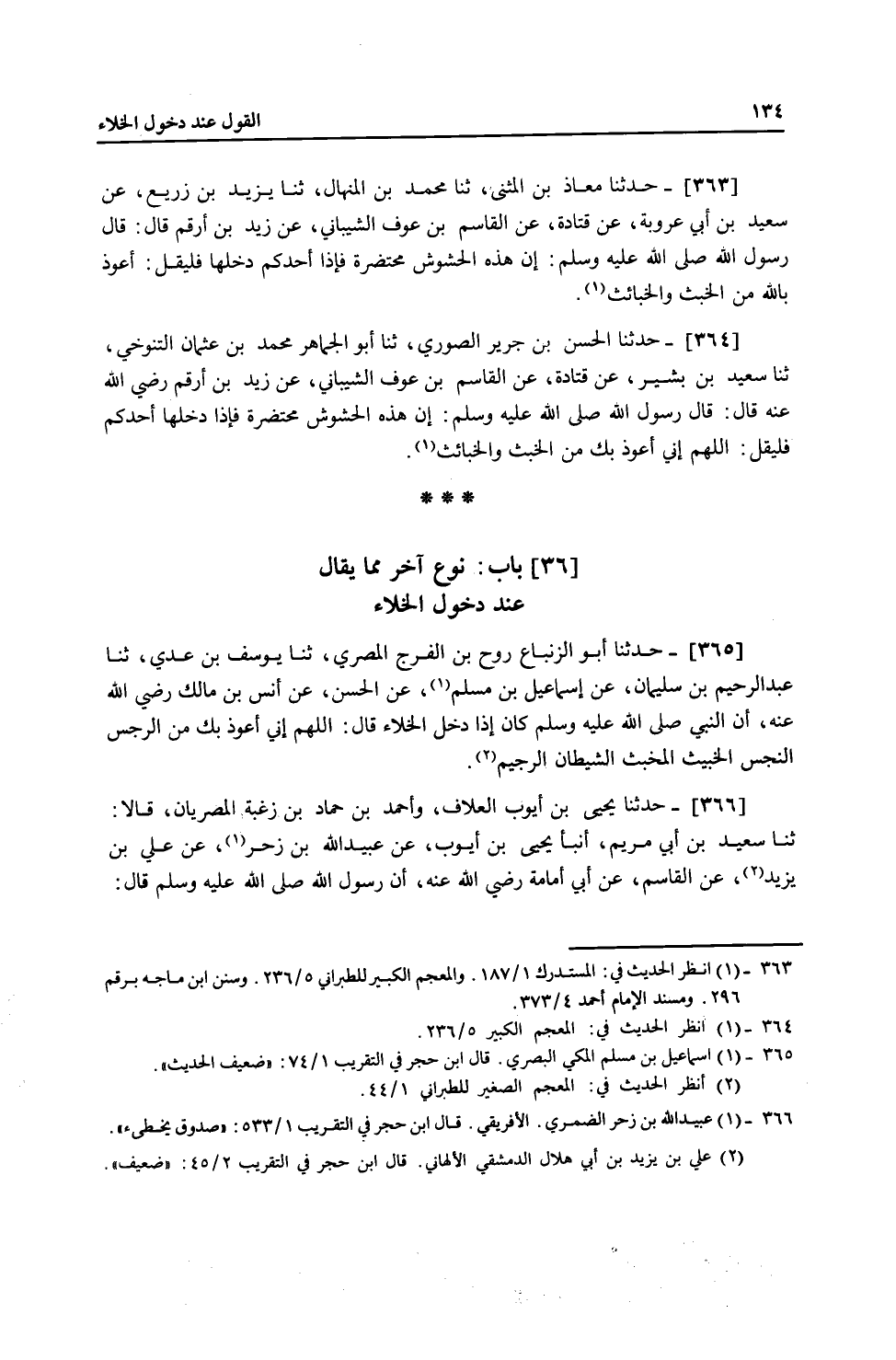 364 - حَدَّثَنَا الْحَسَنُ بْنُ جَرِيرٍ الصُّورِيُّ، ثنا أَبُو الْجُمَاهِرِ مُحَمَّدُ بْنُ عُثْمَانَ التَّنُوخِيُّ، ثنا سَعِيدُ بْنُ بَشِيرٍ، عَنْ قَتَادَةَ، عَنِ الْقَاسِمِ بْنِ عَوْفِ الشَّيْبَانِيِّ، عَنْ زَيْدِ بْنِ أَرْقَمَ، رَضِيَ اللَّهُ عَنْهُ قَالَ: قَالَ رَسُولُ اللَّهِ صَلَّى اللهُ عَلَيْهِ وَسَلَّمَ: " إِنَّ هَذِهِ الْحُشُوشَ مُحْتَضَرَةٌ، فَإِذَا دَخَلَهَا أَحَدُكُمْ فَلْيَقُلِ: اللَّهُمَّ إِنِّي §أَعُوذُ بِكَ مِنَ الْخُبُثِ وَالْخَبَائِثِ "