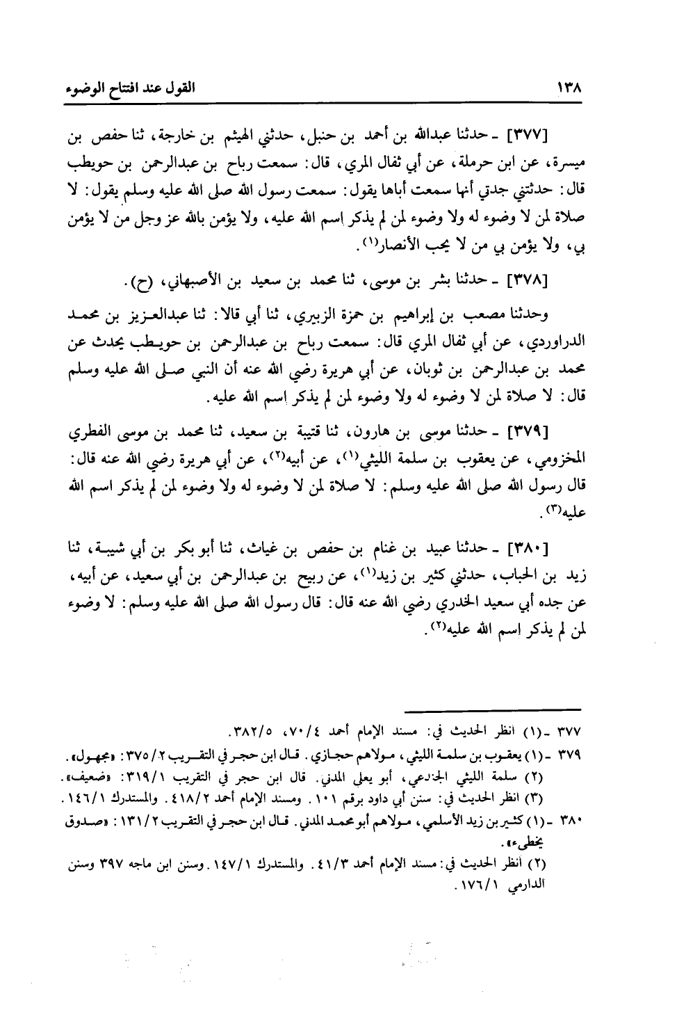 380 - حَدَّثَنَا عُبَيْدُ بْنُ غَنَّامِ بْنِ حَفْصِ بْنِ غِيَاثٍ، ثنا أَبُو بَكْرِ بْنُ أَبِي شَيْبَةَ، ثنا زَيْدُ بْنُ الْحُبَابِ، حَدَّثَنِي كَثِيرُ بْنُ زَيْدٍ، عَنْ رُبَيْحِ بْنِ عَبْدِ الرَّحْمَنِ بْنِ أَبِي سَعِيدٍ، عَنْ أَبِيهِ، عَنْ جَدِّهِ أَبِي سَعِيدٍ الْخُدْرِيِّ، رَضِيَ اللَّهُ عَنْهُ قَالَ: قَالَ رَسُولُ اللَّهِ صَلَّى اللهُ عَلَيْهِ وَسَلَّمَ: «§لَا وُضُوءَ لِمَنْ لَمْ يَذْكُرِ اسْمَ اللَّهِ عَلَيْهِ»