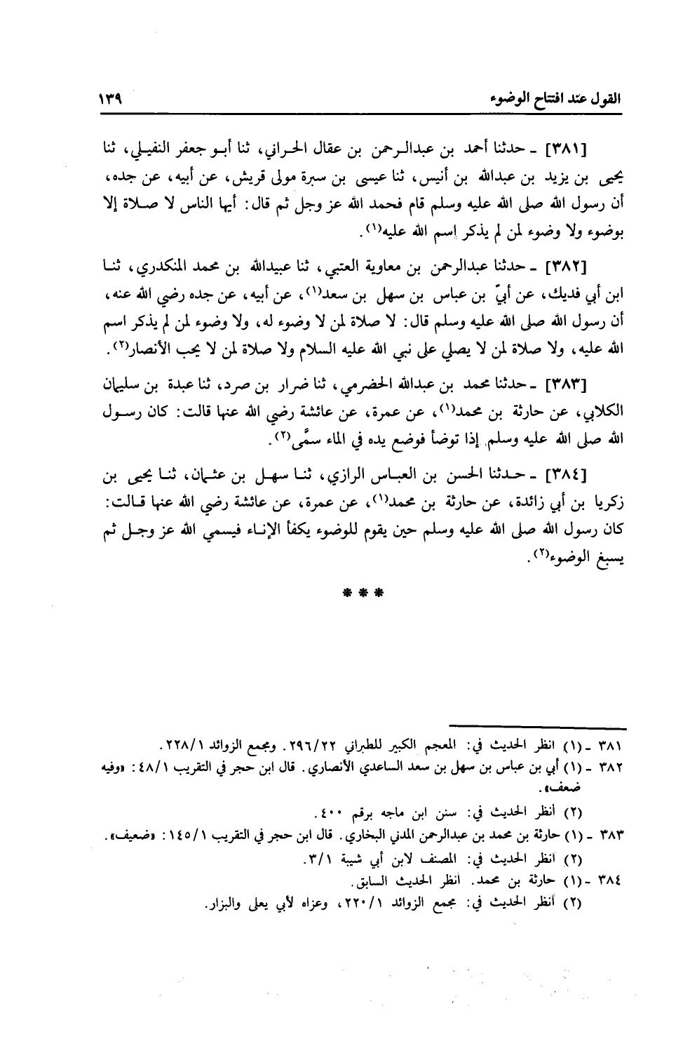381 - حَدَّثَنَا أَحْمَدُ بْنُ عَبْدِ الرَّحْمَنِ بْنِ عِقَالٍ الْحَرَّانِيُّ، ثنا أَبُو جَعْفَرٍ النُّفَيْلِيُّ، ثنا يَحْيَى بْنُ يَزِيدَ بْنِ عَبْدِ اللَّهِ بْنِ أُنَيْسٍ، ثنا عِيسَى بْنُ سَبْرَةَ مَوْلَى قُرَيْشٍ عَنْ أَبِيهِ، عَنْ جَدِّهِ، أَنَّ رَسُولَ اللَّهِ صَلَّى اللهُ عَلَيْهِ وَسَلَّمَ قَامَ فَحَمِدَ اللَّهَ عَزَّ وَجَلَّ ثُمَّ قَالَ: «أَيُّهَا النَّاسُ §لَا صَلَاةَ إِلَّا بِوُضُوءٍ، وَلَا وُضُوءَ لِمَنْ لَمْ يَذْكُرِ اسْمَ اللَّهِ عَلَيْهِ»