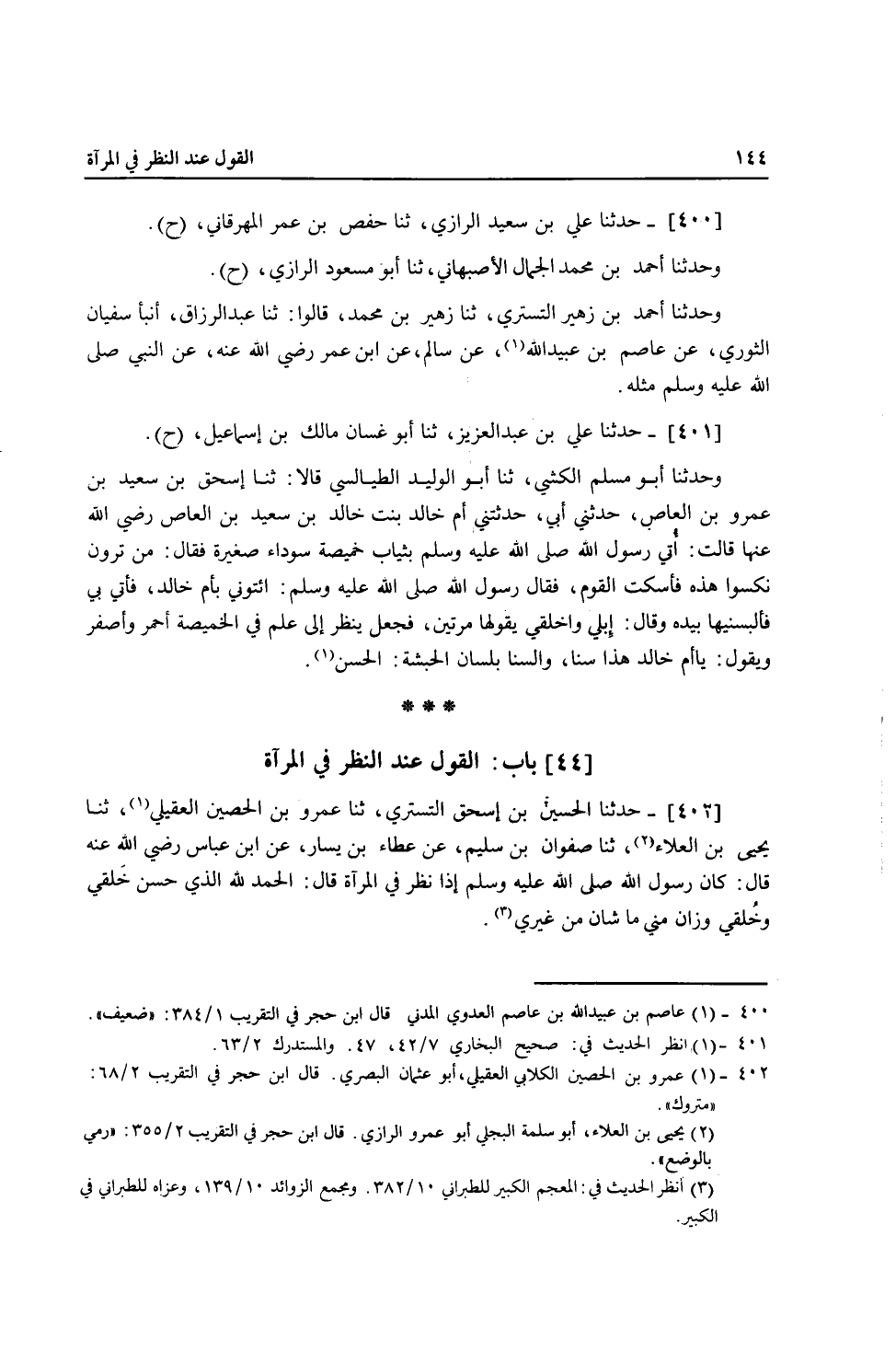 402 - حَدَّثَنَا الْحُسَيْنُ بْنُ إِسْحَاقَ التُّسْتَرِيُّ، ثنا عَمْرُو بْنُ الْحُصَيْنِ الْعُقَيْلِيُّ، ثنا يَحْيَى بْنُ الْعَلَاءِ، ثنا صَفْوَانُ بْنُ سُلَيْمٍ، عَنْ عَطَاءِ بْنِ يَسَارٍ، عَنِ ابْنِ عَبَّاسٍ، رَضِيَ اللَّهُ عَنْهُ قَالَ: كَانَ رَسُولُ اللَّهِ صَلَّى اللهُ عَلَيْهِ وَسَلَّمَ إِذَا نَظَرَ فِي الْمَرْآةِ قَالَ: «§الْحَمْدُ لِلَّهِ الَّذِي حَسَّنَ خَلْقِي وَخُلُقِي وَزَانَ مِنِّي مَا شَانَ مِنْ غَيْرِي»