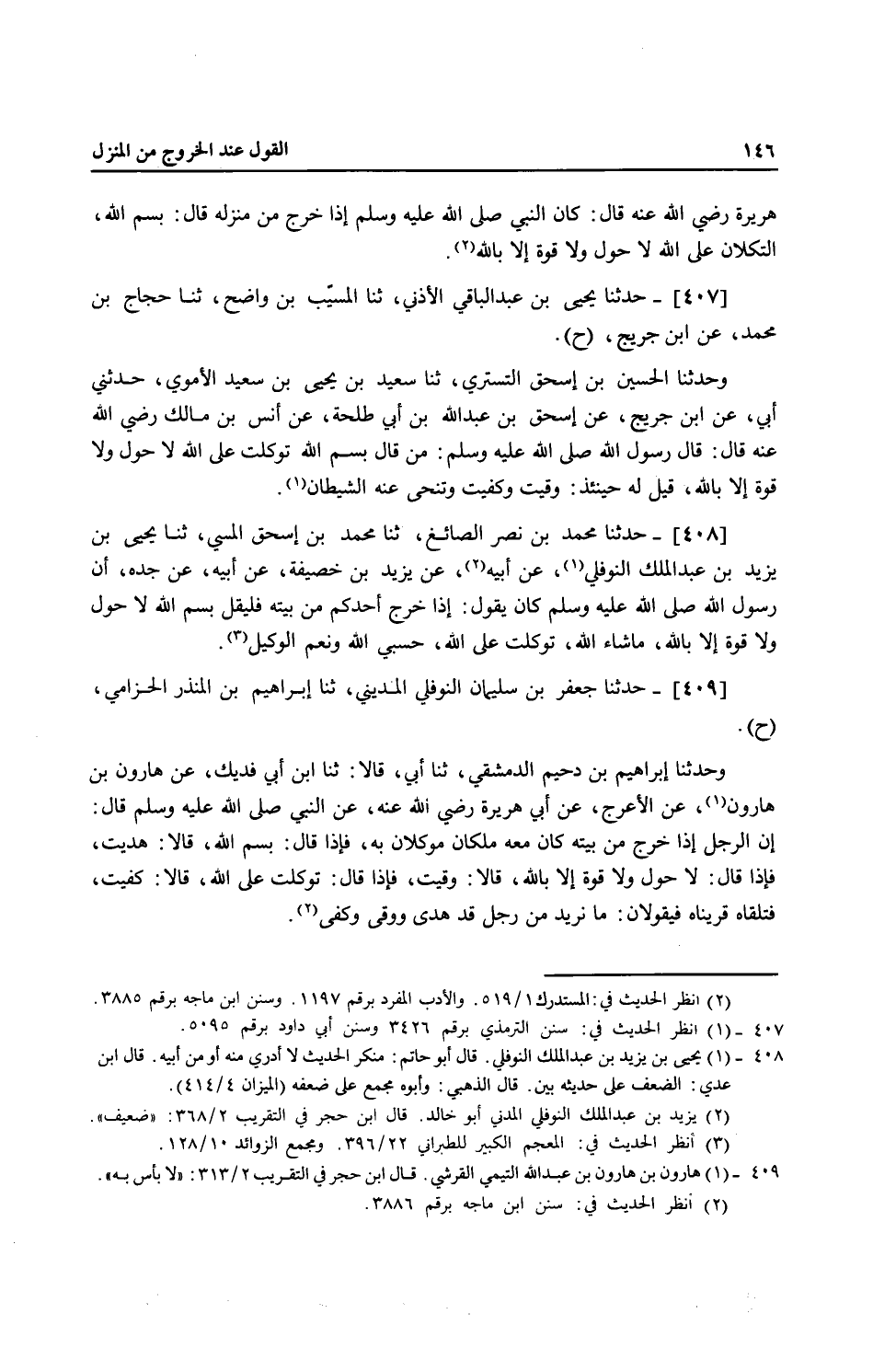 408 - حَدَّثَنَا مُحَمَّدُ بْنُ نَصْرٍ الصَّائِغُ، ثنا مُحَمَّدُ بْنُ إِسْحَاقَ الْمُسَيَّبِيُّ، ثنا يَحْيَى بْنُ يَزِيدَ بْنِ عَبْدِ الْمَلِكِ النَّوْفَلِيُّ، عَنْ أَبِيهِ، عَنْ يَزِيدَ بْنِ خُصَيْفَةَ، عَنْ أَبِيهِ، عَنْ جَدِّهِ، أَنَّ رَسُولَ اللَّهِ صَلَّى اللهُ عَلَيْهِ وَسَلَّمَ كَانَ يَقُولُ: «§إِذَا خَرَجَ أَحَدُكُمْ مِنْ بَيْتِهِ فَلْيَقُلْ بِسْمِ اللَّهِ لَا حَوْلَ وَلَا قُوَّةَ إِلَّا بِاللَّهِ مَا شَاءَ اللَّهُ، تَوَكَّلْتُ عَلَى اللَّهِ، حَسْبِيَ اللَّهُ وَنِعْمَ الْوَكِيلُ»