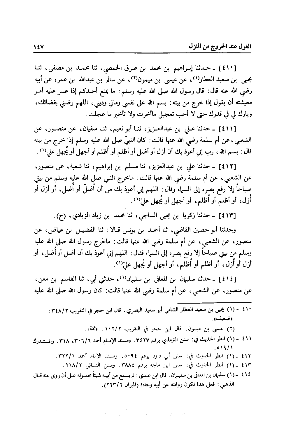 413 - حَدَّثَنَا زَكَرِيَّا بْنُ يَحْيَى السَّاجِيُّ، ثنا مُحَمَّدُ بْنُ زِيَادٍ الزِّيَادِيُّ، ح وَحَدَّثَنَا أَبُو حَصِينٍ الْقَاضِي، ثنا أَحْمَدُ بْنُ يُونُسَ، قَالَا: ثنا الْفُضَيْلُ بْنُ عِيَاضٍ، عَنْ مَنْصُورٍ، عَنِ الشَّعْبِيِّ، عَنْ أُمِّ سَلَمَةَ، رَضِيَ اللَّهُ عَنْهَا قَالَتْ: مَا خَرَجَ رَسُولُ اللَّهِ صَلَّى اللهُ عَلَيْهِ وَسَلَّمَ مِنْ بَيْتِي صَبَاحًا إِلَّا رَفَعَ بَصَرَهُ إِلَى السَّمَاءِ فَقَالَ: «§اللَّهُمَّ إِنِّي أَعُوذُ بِكَ أَنْ أَضِلَّ أَوْ أُضَلَّ أَوْ أَزِلَّ أَوْ أُزَلَّ أَوْ أَظْلِمَ أَوْ أُظْلَمَ أَوْ أَجْهَلَ أَوْ يُجْهَلَ عَلَيَّ»