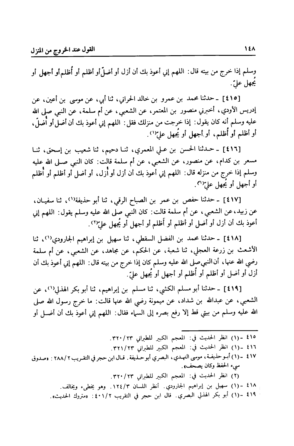 415 - حَدَّثَنَا مُحَمَّدُ بْنُ عَمْرِو بْنِ خَالِدٍ الْحَرَّانِيُّ، ثنا أَبِي، عَنْ مُوسَى بْنِ أَعْيَنَ، عَنْ إِدْرِيسَ الْأَوْدِيِّ، أَخْبَرَنِي مَنْصُورُ بْنُ الْمُعْتَمِرِ، عَنِ الشَّعْبِيِّ، عَنْ أُمِّ سَلَمَةَ، عَنِ النَّبِيِّ صَلَّى اللهُ عَلَيْهِ وَسَلَّمَ أَنَّهُ كَانَ يَقُولُ: " §إِذَا خَرَجْتَ مِنْ مَنْزِلِكَ فَقُلِ: اللَّهُمَّ إِنِّي أَعُوذُ بِكَ أَنْ أَزِلَّ أَوْ أُضَلَّ، أَوْ أَظْلِمَ أَوْ أُظْلَمَ، أَوْ أَجْهَلَ أَوْ يُجْهَلَ عَلَيَّ "