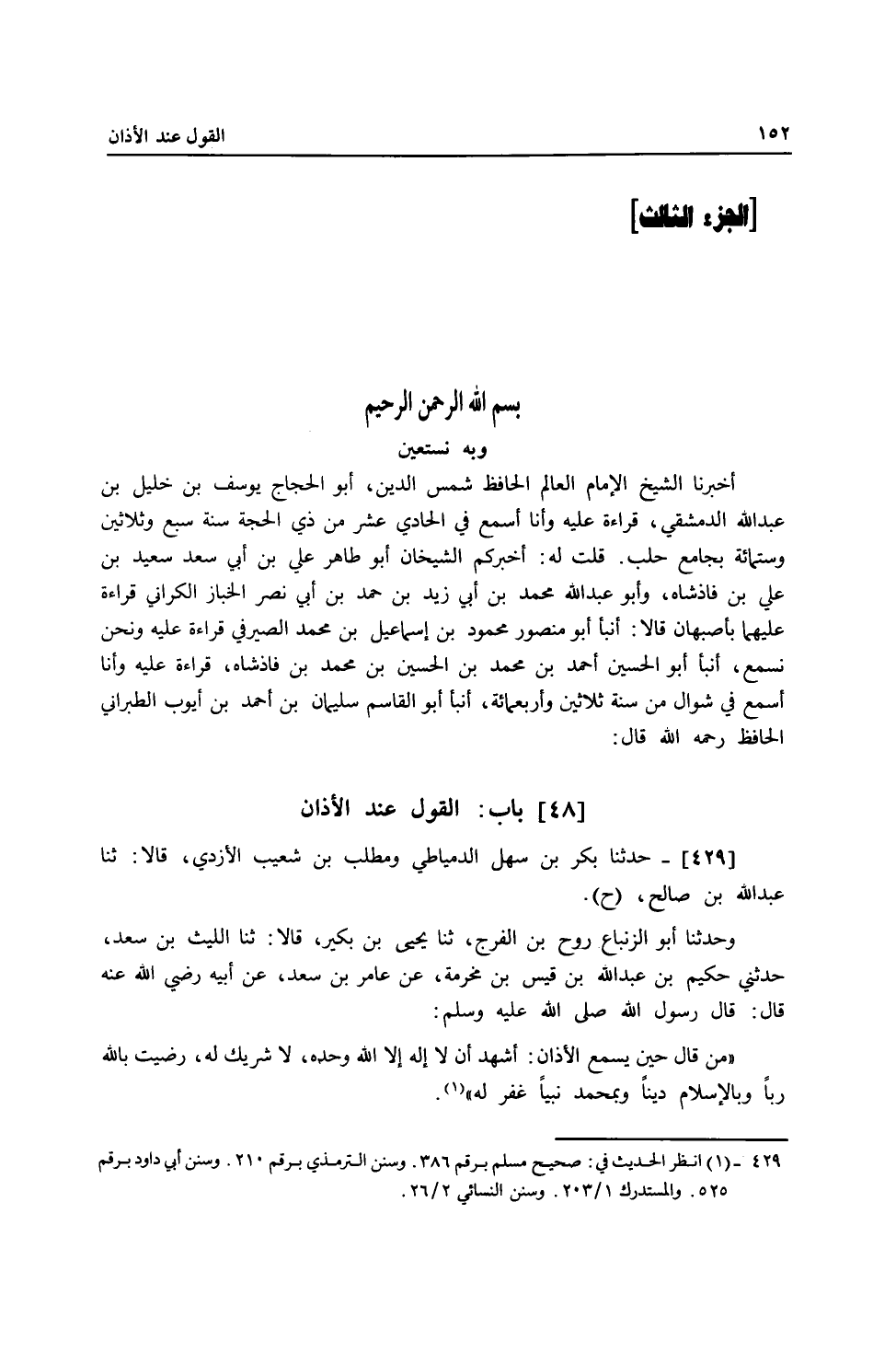 429 - حَدَّثَنَا بَكْرُ بْنُ سَهْلِ الدِّمْيَاطِيُّ، وَمُطَّلِبُ بْنُ شُعَيْبٍ الْأَزْدِيُّ، قَالَا: ثنا عَبْدُ اللَّهِ بْنُ صَالِحٍ، ح وَحَدَّثَنَا أَبُو الزِّنْبَاعِ رَوْحُ بْنُ الْفَرَجِ، ثنا يَحْيَى بْنُ بُكَيْرٍ، قَالَا: ثنا اللَّيْثُ بْنُ سَعْدٍ، حَدَّثَنِي حُكَيْمُ بْنُ عَبْدِ اللَّهِ بْنِ قَيْسِ بْنِ مَخْرَمَةَ، عَنْ عَامِرِ بْنِ سَعْدٍ، عَنْ أَبِيهِ رَضِيَ اللَّهُ عَنْهُ قَالَ: قَالَ رَسُولُ اللَّهِ صَلَّى اللهُ عَلَيْهِ وَسَلَّمَ: " §مَنْ قَالَ حِينَ يَسْمَعُ الْأَذَانَ: أَشْهَدُ أَنْ لَا إِلَهَ إِلَّا اللَّهُ، وَحْدَهُ لَا شَرِيكَ لَهُ رَضِيتُ بِاللَّهِ رَبًّا، وَبِالْإِسْلَامِ دِينًا، وَبِمُحَمَّدٍ نَبِيًّا غُفِرَ لَهُ " حَدَّثَنَا بَكْرُ بْنُ سَهْلِ الدِّمْيَاطِيُّ، وَمُطَّلِبُ بْنُ شُعَيْبٍ الْأَزْدِيُّ، قَالَا: ثنا عَبْدُ اللَّهِ بْنُ صَالِحٍ، ح وَحَدَّثَنَا أَبُو الزِّنْبَاعِ رَوْحُ بْنُ الْفَرَجِ، ثنا يَحْيَى بْنُ بُكَيْرٍ، قَالَا: ثنا اللَّيْثُ بْنُ سَعْدٍ، حَدَّثَنِي حُكَيْمُ بْنُ عَبْدِ اللَّهِ بْنِ قَيْسِ بْنِ مَخْرَمَةَ، عَنْ عَامِرِ بْنِ سَعْدٍ، عَنْ أَبِيهِ، رَضِيَ اللَّهُ عَنْهُ قَالَ: قَالَ رَسُولُ اللَّهِ صَلَّى اللهُ عَلَيْهِ وَسَلَّمَ: " مَنْ قَالَ حِينَ يَسْمَعُ الْأَذَانَ: أَشْهَدُ أَنْ لَا إِلَهَ إِلَّا اللَّهُ، وَحْدَهُ لَا شَرِيكَ لَهُ رَضِيتُ بِاللَّهِ رَبًّا، وَبِالْإِسْلَامِ دِينًا، وَبِمُحَمَّدٍ نَبِيًّا غُفِرَ لَهُ "