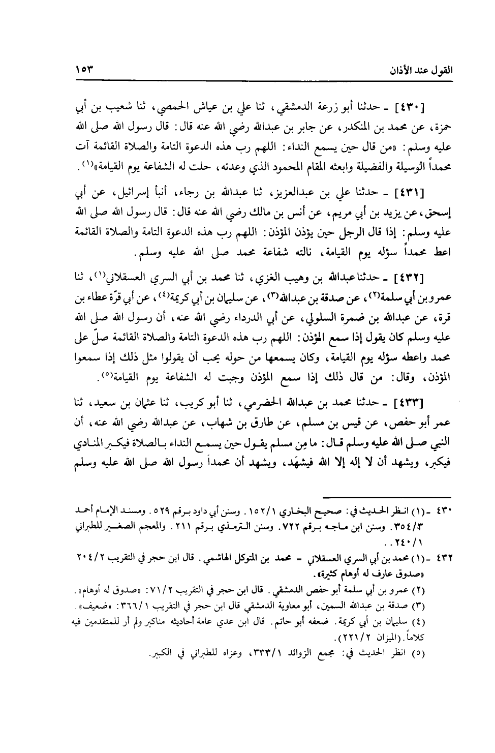 430 - حَدَّثَنَا أَبُو زُرْعَةَ الدِّمَشْقِيُّ، ثنا عَلِيُّ بْنُ عَيَّاشٍ الْحِمْصِيُّ، ثنا شُعَيْبُ بْنُ أَبِي حَمْزَةَ، عَنْ مُحَمَّدِ بْنِ الْمُنْكَدِرِ، عَنْ جَابِرِ بْنِ عَبْدِ اللَّهِ، رَضِيَ اللَّهُ عَنْهُ قَالَ: قَالَ رَسُولُ اللَّهِ صَلَّى اللهُ عَلَيْهِ وَسَلَّمَ: " §مَنْ قَالَ حِينَ يَسْمَعُ النِّدَاءَ: اللَّهُمَّ رَبَّ هَذِهِ الدَّعْوَةِ التَّامَّةِ وَالصَّلَاةِ الْقَائِمَةِ، آتِ مُحَمَّدًا الْوَسِيلَةَ وَالْفَضِيلَةَ، وَابْعَثْهُ الْمَقَامَ الْمَحْمُودَ الَّذِي وَعَدْتَهُ، حَلَّتْ لَهُ الشَّفَاعَةُ يَوْمَ الْقِيَامَةِ "