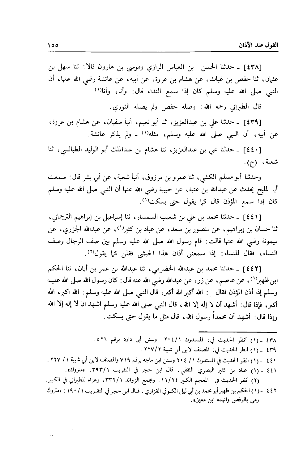 438 - حَدَّثَنَا الْحَسَنُ بْنُ الْعَبَّاسِ الرَّازِيُّ، وَمُوسَى بْنُ هَارُونَ، قَالَا: ثنا سَهْلُ بْنُ عُثْمَانَ، ثنا حَفْصُ بْنُ غِيَاثٍ، عَنْ هِشَامِ بْنِ عُرْوَةَ، عَنْ أَبِيهِ، عَنْ عَائِشَةَ، رَضِيَ اللَّهُ عَنْهَا أَنَّ النَّبِيَّ صَلَّى اللهُ عَلَيْهِ وَسَلَّمَ كَانَ §إِذَا سَمِعَ النِّدَاءَ قَالَ: «وَأَنَا، وَأَنَا» قَالَ الطَّبَرَانِيُّ رَحِمَهُ اللَّهُ: وَصَلَهُ حَفْصٌ وَلَمْ يَصِلْهُ الثَّوْرِيُّ