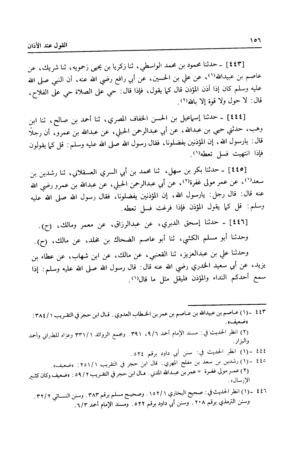 446 - حَدَّثَنَا إِسْحَاقُ الدَّبَرِيُّ، عَنْ عَبْدِ الرَّزَّاقِ، عَنْ مَعْمَرٍ، وَمَالِكٍ، ح وَحَدَّثَنَا أَبُو مُسْلِمٍ الْكَشِّيُّ، ثنا أَبُو عَاصِمٍ الضَّحَّاكُ بْنُ مَخْلَدٍ، عَنْ مَالِكٍ، ح وَحَدَّثَنَا عَلِيُّ بْنُ عَبْدِ الْعَزِيزِ، ثنا الْقَعْنَبِيُّ، عَنْ مَالِكٍ، عَنِ ابْنِ شِهَابٍ، عَنْ عَطَاءِ بْنِ يَزِيدَ، عَنْ أَبِي سَعِيدٍ الْخُدْرِيِّ، رَضِيَ اللَّهُ عَنْهُ قَالَ: قَالَ رَسُولُ اللَّهِ صَلَّى اللهُ عَلَيْهِ وَسَلَّمَ: «§إِذَا سَمِعَ أَحَدُكُمُ النِّدَاءَ وَالْمُؤَذِّنَ فَلْيَقُلْ مِثْلَ مَا قَالَ»