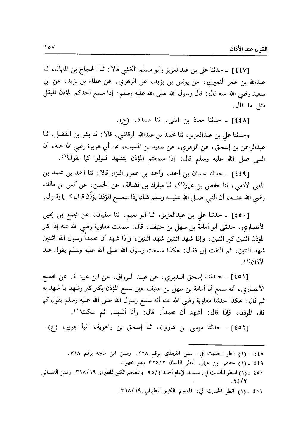 448 - حَدَّثَنَا مُعَاذُ بْنُ الْمُثَنَّى، ثنا مُسَدَّدٌ، ح وَحَدَّثَنَا عَلِيُّ بْنُ عَبْدِ الْعَزِيزِ، ثنا مُحَمَّدُ بْنُ عَبْدِ اللَّهِ الرَّقَاشِيُّ، قَالَا: ثنا بِشْرُ بْنُ الْمُفَضَّلِ، ثنا عَبْدُ الرَّحْمَنِ بْنُ إِسْحَاقَ، عَنِ الزُّهْرِيِّ، عَنْ سَعِيدِ بْنِ الْمُسَيِّبِ، عَنْ أَبِي هُرَيْرَةَ، رَضِيَ اللَّهُ عَنْهُ أَنَّ النَّبِيَّ صَلَّى اللهُ عَلَيْهِ وَسَلَّمَ قَالَ: «§إِذَا سَمِعْتُمُ الْمُؤَذِّنَ يَتَشَهَّدُ فَقُولُوا كَمَا يَقُولُ»