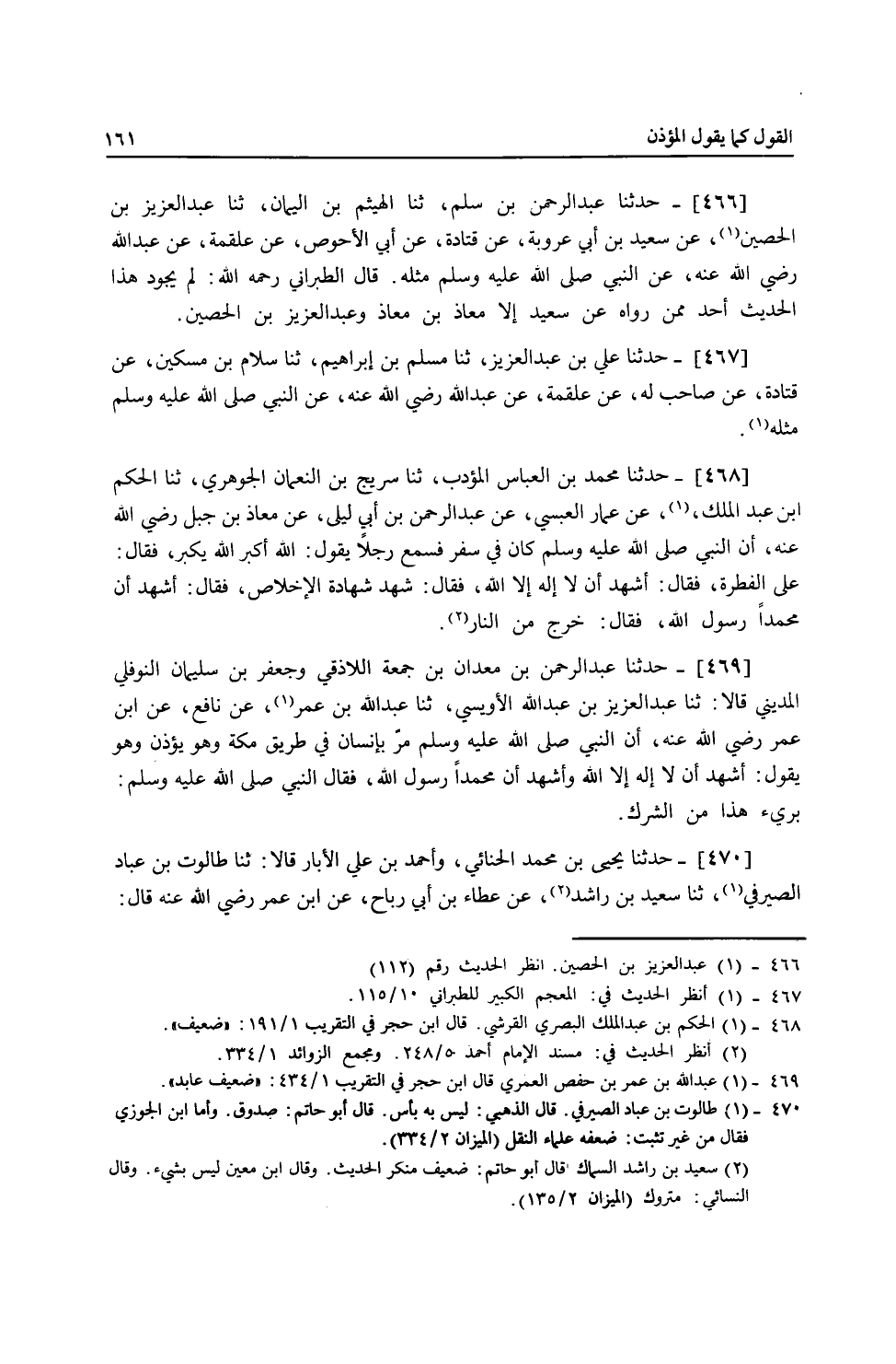 469 - حَدَّثَنَا عَبْدُ الرَّحْمَنِ بْنُ مَعْدَانَ بْنِ جُمُعَةَ اللَّاذِقِيُّ، وَجَعْفَرُ بْنُ سُلَيْمَانَ النَّوْفَلِيُّ الْمَدِينِيُّ، قَالَا: ثنا عَبْدُ الْعَزِيزِ بْنُ عَبْدِ اللَّهِ الْأُوَيْسِيُّ، ثنا عَبْدُ اللَّهِ بْنُ عُمَرَ، عَنْ نَافِعٍ، عَنِ ابْنِ عُمَرَ، رَضِيَ اللَّهُ عَنْهُ أَنَّ النَّبِيَّ صَلَّى اللهُ عَلَيْهِ وَسَلَّمَ مَرَّ بِإِنْسَانٍ فِي طَرِيقِ مَكَّةَ وَهُوَ يُؤَذِّنُ وَهُوَ يَقُولُ: أَشْهَدُ أَنْ لَا إِلَهَ إِلَّا اللَّهُ، وَأَشْهَدُ أَنَّ مُحَمَّدًا رَسُولُ اللَّهِ، فَقَالَ النَّبِيُّ صَلَّى اللهُ عَلَيْهِ وَسَلَّمَ: «§بَرِئَ هَذَا مِنَ الشِّرْكِ»