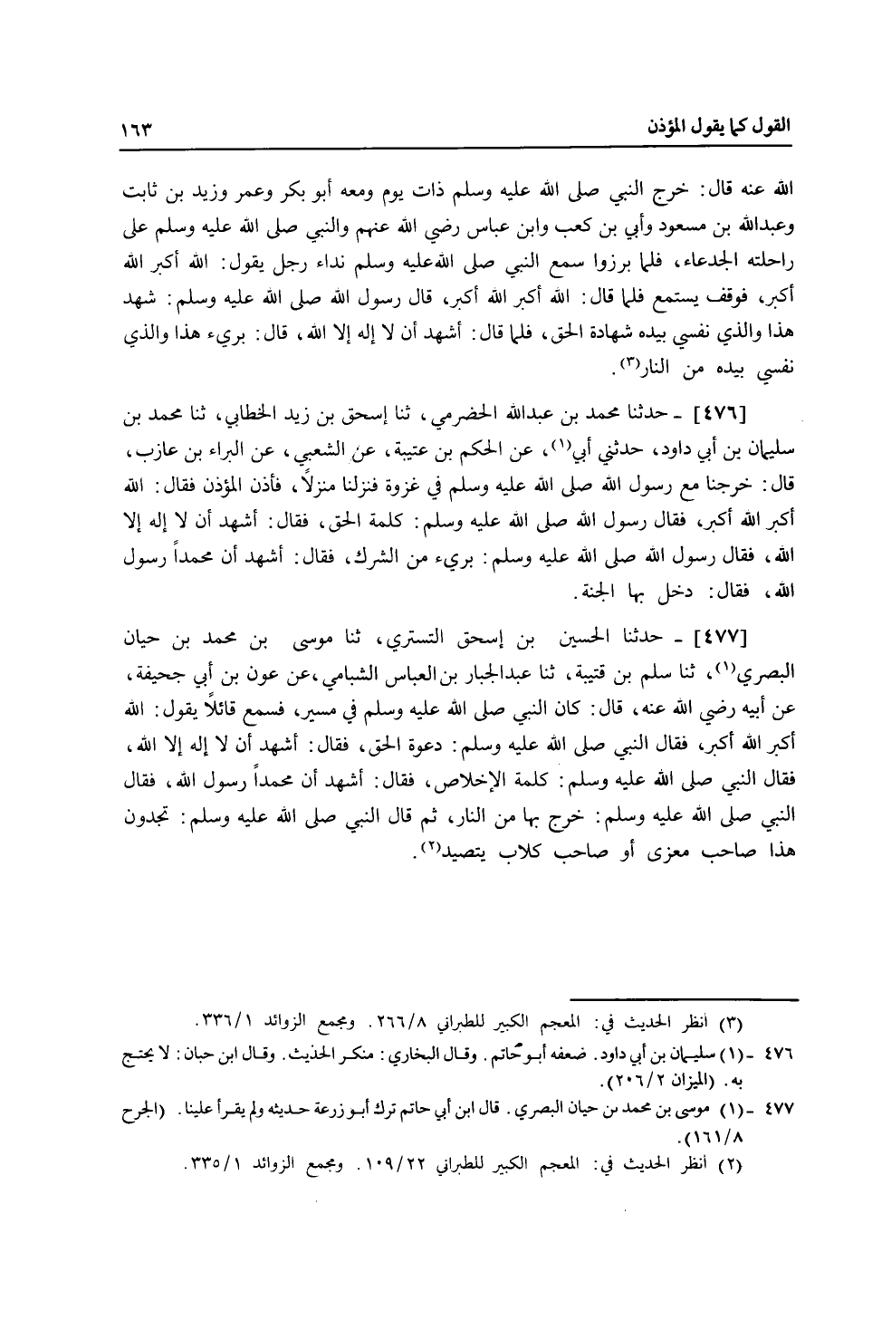 476 - حَدَّثَنَا مُحَمَّدُ بْنُ عَبْدِ اللَّهِ الْحَضْرَمِيُّ، ثنا إِسْحَاقُ بْنُ زَيْدٍ الْخَطَّابِيُّ، ثنا مُحَمَّدُ بْنُ سُلَيْمَانَ بْنِ أَبِي دَاوُدَ، حَدَّثَنِي أَبِي، عَنِ الْحَكَمِ بْنِ عُتَيْبَةَ، عَنِ الشَّعْبِيِّ، عَنِ الْبَرَاءِ بْنِ عَازِبٍ، قَالَ: خَرَجْنَا مَعَ رَسُولِ اللَّهِ صَلَّى اللهُ عَلَيْهِ وَسَلَّمَ فِي غَزْوَةٍ فَنَزَلْنَا مَنْزِلًا فَأَذَّنَ الْمُؤَذِّنُ فَقَالَ: اللَّهُ أَكْبَرُ اللَّهُ أَكْبَرُ، فَقَالُ رَسُولُ اللَّهِ صَلَّى اللهُ عَلَيْهِ وَسَلَّمَ: «§كَلِمَةَ الْحَقِّ» فَقَالَ: أَشْهَدُ أَنْ لَا إِلَهَ إِلَّا اللَّهُ، فَقَالَ رَسُولُ اللَّهِ صَلَّى اللهُ عَلَيْهِ وَسَلَّمَ: «بَرِئَ مِنَ الشِّرْكِ» فَقَالَ: أَشْهَدُ أَنَّ مُحَمَّدًا رَسُولُ اللَّهِ، فَقَالَ: «دَخَلَ بِهَا الْجَنَّةَ»
