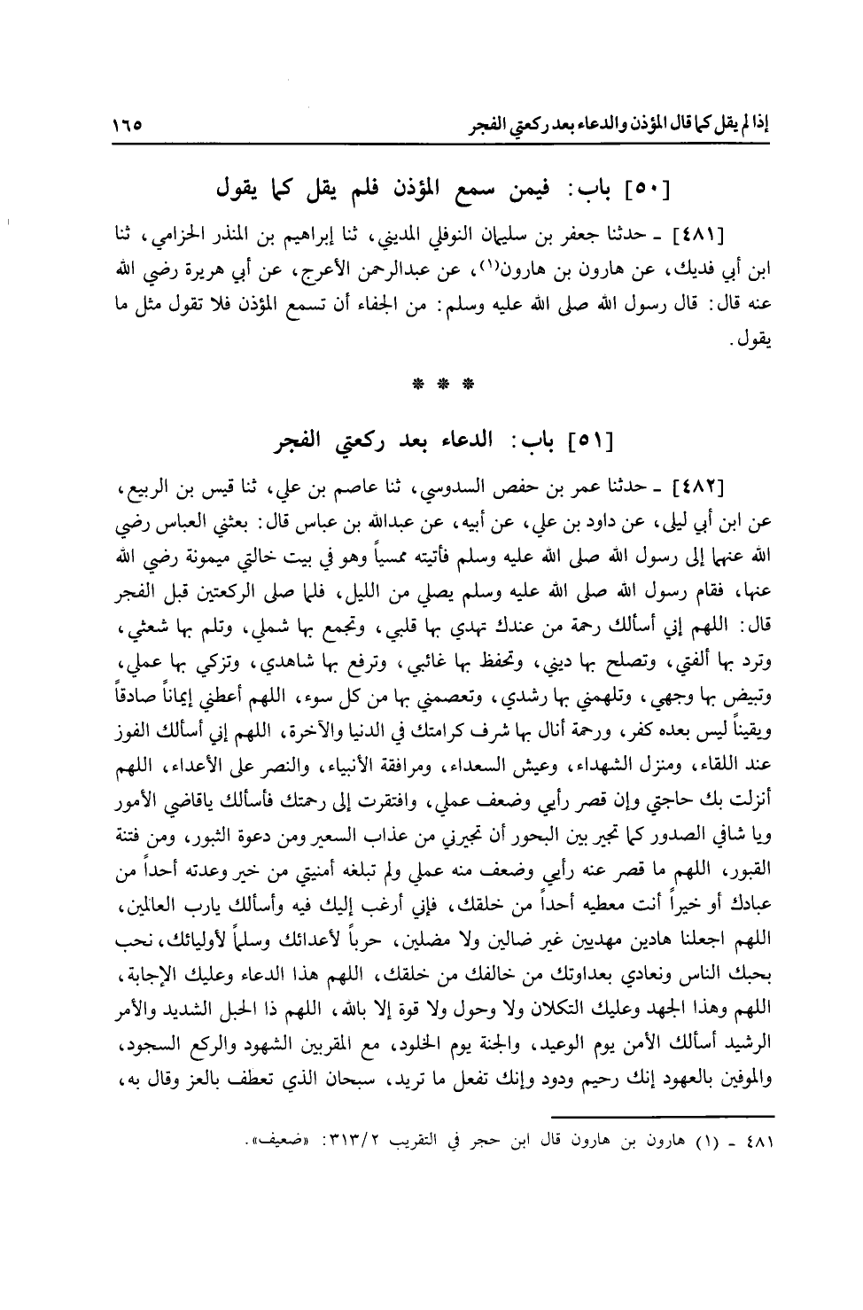 481 - حَدَّثَنَا جَعْفَرُ بْنُ سُلَيْمَانَ النَّوْفَلِيُّ الْمَدِينِيُّ، ثنا إِبْرَاهِيمُ بْنُ الْمُنْذِرِ الْحِزَامِيُّ، ثنا ابْنُ أَبِي فُدَيْكٍ، عَنْ هَارُونَ بْنِ هَارُونَ، عَنْ عَبْدِ الرَّحْمَنِ الْأَعْرَجِ، عَنْ أَبِي هُرَيْرَةَ، رَضِيَ اللَّهُ عَنْهُ قَالَ: قَالَ رَسُولُ اللَّهِ صَلَّى اللهُ عَلَيْهِ وَسَلَّمَ: «§مِنَ الْجَفَاءِ أَنْ تَسْمَعَ الْمُؤَذِّنَ فَلَا تَقُولُ مِثْلَ مَا يَقُولُ»