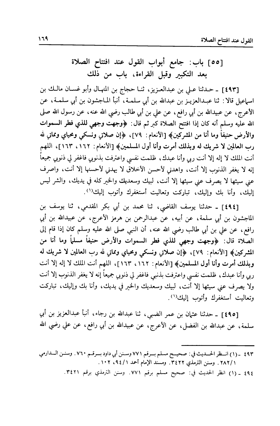 495 - حَدَّثَنَا عُثْمَانُ بْنُ عُمَرَ الضَّبِّيُّ، ثنا عَبْدُ اللَّهِ بْنُ رَجَاءٍ، أَنْبَأَ عَبْدُ الْعَزِيزِ بْنُ أَبِي سَلَمَةَ، عَنْ عَبْدِ اللَّهِ بْنِ الْفَضْلِ، عَنِ الْأَعْرَجِ، عَنْ عُبَيْدِ اللَّهِ بْنِ أَبِي رَافِعٍ، عَنْ عَلِيٍّ، رَضِيَ اللَّهُ -[170]- عَنْهُ أَنَّ رَسُولَ اللَّهِ صَلَّى اللهُ عَلَيْهِ وَسَلَّمَ كَانَ إِذَا اسْتَفْتَحَ كَبَّرَ ثُمَّ قَالَ: «§وَجَّهْتُ وَجْهِي لِلَّذِي فَطَرَ السَّمَوَاتِ وَالْأَرْضَ حَنِيفًا وَمَا أَنَا مِنَ الْمُشْرِكِينَ، إِنَّ صَلَاتِي وَنُسُكِي وَمَحْيَايَ وَمَمَاتِي لِلَّهِ رَبِّ الْعَالَمِينَ، لَا شَرِيكَ لَهُ وَبِذَلِكَ أُمِرْتُ وَأَنَا مِنَ الْمُسْلِمِينَ، اللَّهُمَّ أَنْتَ الْمَلِكُ لَا إِلَهَ إِلَّا أَنْتَ، رَبِّي وَأَنَا عَبْدُكَ، ظَلَمْتُ نَفْسِي وَاعْتَرَفْتُ بِذَنْبِي فَاغْفِرْ لِي ذُنُوبِي جَمِيعًا إِنَّهُ لَا يَغْفِرُ الذُّنُوبَ إِلَّا أَنْتَ، وَاهْدِنِي لِأَحْسَنِ الْأَخْلَاقِ إِنَّهُ لَا يَهْدِي لِأَحْسَنِهَا إِلَّا أَنْتَ، وَاصْرِفْ عَنِّي سَيِّئَهَا لَا يَصْرِفُ عَنِّي سَيِّئَهَا إِلَّا أَنْتَ، لَبَّيْكَ وَسَعْدَيْكَ وَالْخَيْرُ كُلُّهُ فِي يَدَيْكَ، وَالشَّرُّ لَيْسَ إِلَيْكَ أَنَا بِكَ وَإِلَيْكَ، تَبَارَكْتَ وَتَعَالَيْتَ، أَسْتَغْفِرُكَ وَأَتُوبُ إِلَيْكَ»