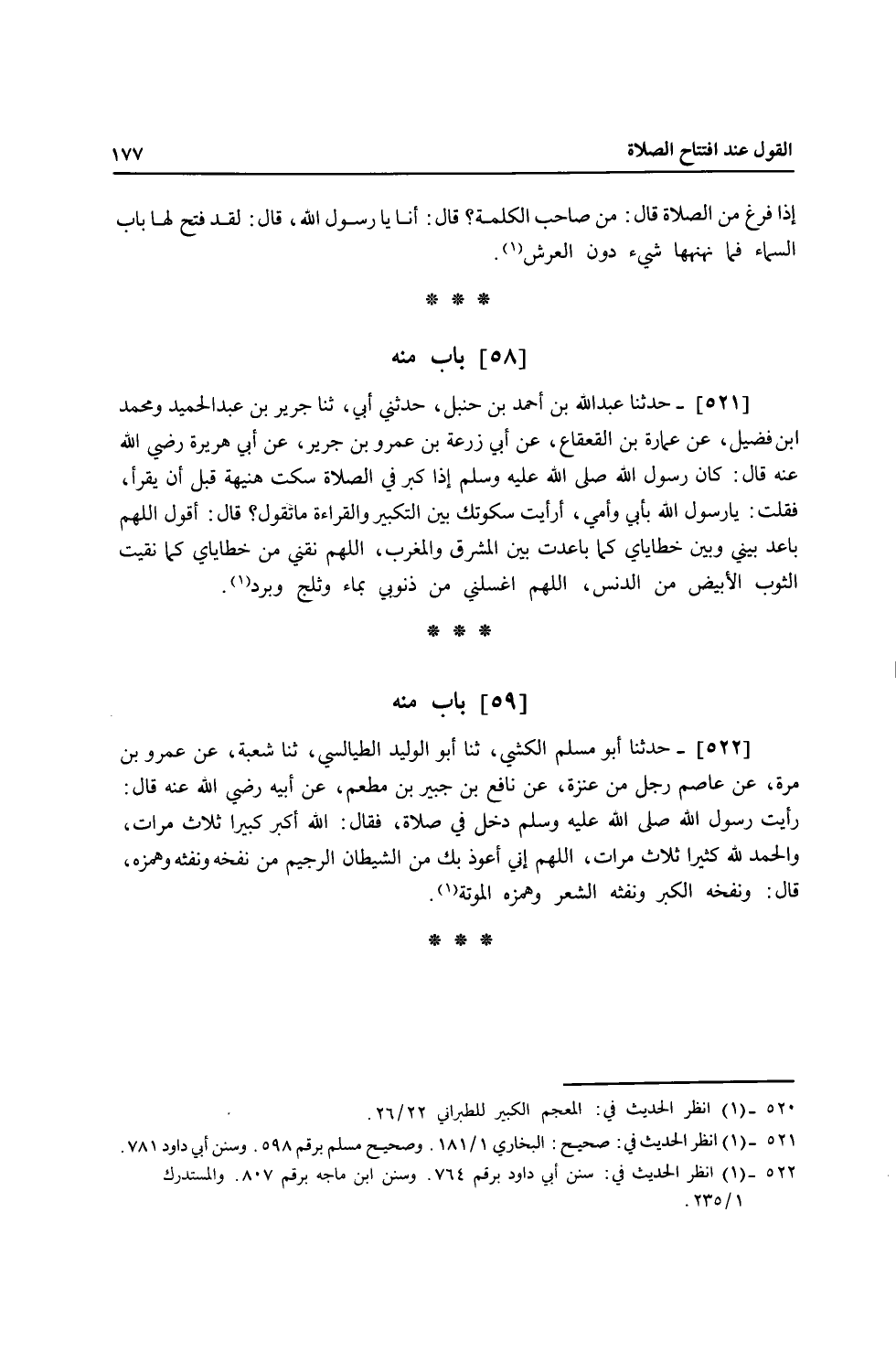 521 - حَدَّثَنَا عَبْدُ اللَّهِ بْنُ أَحْمَدَ بْنِ حَنْبَلٍ، حَدَّثَنِي أَبِي، ثنا جَرِيرُ بْنُ عَبْدِ الْحَمِيدِ، وَمُحَمَّدُ بْنُ فُضَيْلٍ، عَنْ عُمَارَةَ بْنِ الْقَعْقَاعِ، عَنْ أَبِي زُرْعَةَ بْنِ عَمْرِو بْنِ جَرِيرٍ، عَنْ أَبِي هُرَيْرَةَ، رَضِيَ اللَّهُ عَنْهُ قَالَ: كَانَ رَسُولُ اللَّهِ صَلَّى اللهُ عَلَيْهِ وَسَلَّمَ إِذَا كَبَّرَ فِي الصَّلَاةِ سَكَتَ هُنَيْهَةً قَبْلَ أَنْ يَقْرَأَ، فَقُلْتُ: يَا رَسُولَ اللَّهِ بِأَبِي أَنْتَ وَأُمِّي أَرَأَيْتَ سُكُوتَكَ بَيْنَ التَّكْبِيرِ وَالْقِرَاءَةِ مَا تَقُولُ؟ قَالَ: " أَقُولُ: §اللَّهُمَّ بَاعِدْ بَيْنِي وَبَيْنَ خَطَايَايَ كَمَا بَاعَدْتَ بَيْنَ الْمَشْرِقِ وَالْمَغْرِبِ، اللَّهُمَّ نَقِّنِي مِنْ خَطَايَايَ كَمَا نَقَّيْتَ الثَّوْبَ الْأَبْيَضَ مِنَ الدَّنَسِ، اللَّهُمَّ اغْسِلْنِي مِنْ ذُنُوبِي بِمَاءٍ وَثَلْجٍ وَبَرَدٍ "
