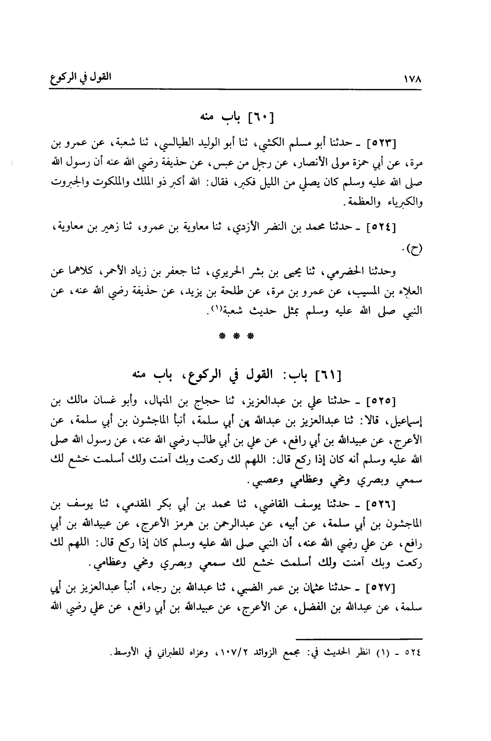 523 - حَدَّثَنَا أَبُو مُسْلِمٍ الْكَشِّيُّ، ثنا أَبُو الْوَلِيدِ الطَّيَالِسِيُّ، ثنا شُعْبَةُ، عَنْ عَمْرِو بْنِ مُرَّةَ، عَنْ أَبِي حَمْزَةَ مَوْلَى الْأَنْصَارِ عَنْ رَجُلٍ مِنْ عَبْسٍ عَنْ حُذَيْفَةَ، رَضِيَ اللَّهُ عَنْهُ أَنَّ رَسُولَ اللَّهِ صَلَّى اللهُ عَلَيْهِ وَسَلَّمَ كَانَ §يُصَلِّي مِنَ اللَّيْلِ فَكَبَّرَ فَقَالَ: «اللَّهُ أَكْبَرُ ذُو الْمُلْكِ، وَالْمَلَكُوتِ، وَالْجَبَرُوتِ، وَالْكِبْرِيَاءِ، وَالْعَظَمَةِ»