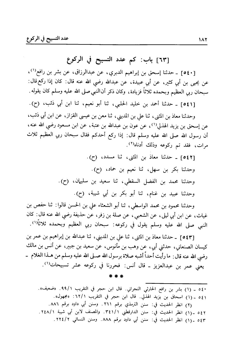 543 - حَدَّثَنَا مُعَاذُ بْنُ الْمُثَنَّى، ثنا عَلِيُّ بْنُ الْمَدِينِيِّ، ثنا عَبْدُ اللَّهِ بْنُ إِبْرَاهِيمَ بْنِ عُمَرَ بْنِ كَيْسَانَ الصَّنْعَانِيُّ، حَدَّثَنِي أَبِي، عَنْ وَهْبِ بْنِ مَأْنُوسٍ، عَنْ سَعِيدِ بْنِ جُبَيْرٍ، عَنْ أَنَسِ بْنِ مَالِكٍ، رَضِيَ اللَّهُ عَنْهُ قَالَ: مَا رَأَيْتُ أَحَدًا أَشْبَهَ صَلَاةً بِرَسُولِ اللَّهِ صَلَّى اللهُ عَلَيْهِ وَسَلَّمَ مِنْ هَذَا الْغُلَامِ يَعْنِي عُمَرَ بْنَ عَبْدِ الْعَزِيزِ قَالَ أَنَسٌ: فَحَرَّرْنَا §فِي رُكُوعِهِ عَشْرَ تَسْبِيحَاتٍ