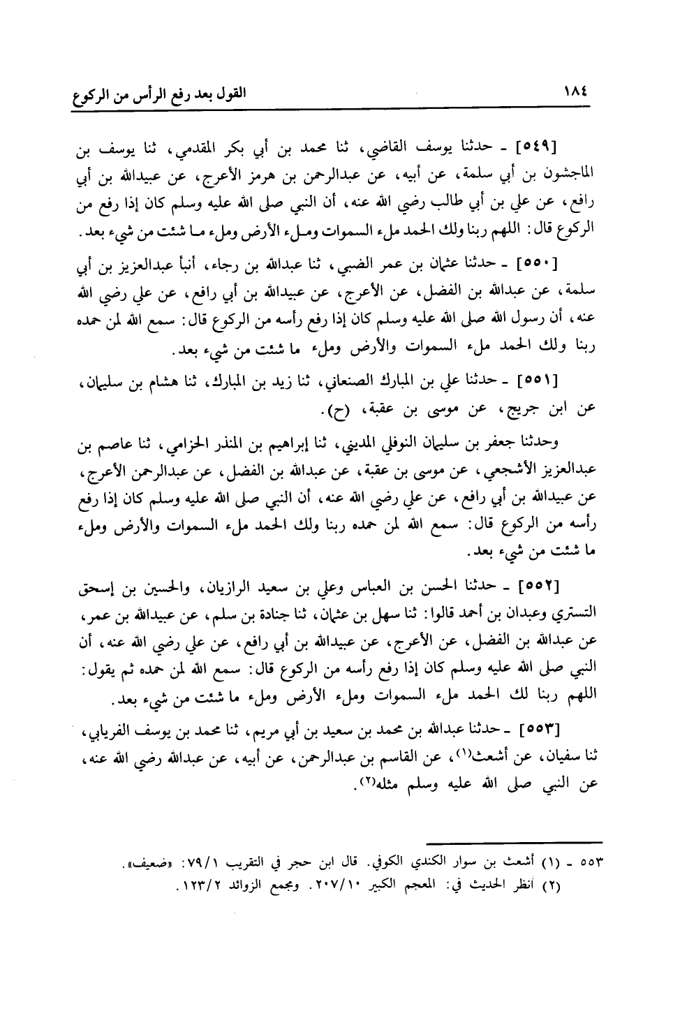 551 - حَدَّثَنَا عَلِيُّ بْنُ الْمُبَارَكِ الصَّنْعَانِيُّ، ثنا زَيْدُ بْنُ الْمُبَارَكِ، ثنا هِشَامُ بْنُ سُلَيْمَانَ، عَنِ ابْنِ جُرَيْجٍ، عَنْ مُوسَى بْنِ عُقْبَةَ، ح وَحَدَّثَنَا جَعْفَرُ بْنُ سُلَيْمَانَ النَّوْفَلِيُّ الْمَدِينِيُّ، ثنا إِبْرَاهِيمُ بْنُ الْمُنْذِرِ الْحِزَامِيُّ، ثنا عَاصِمُ بْنُ عَبْدِ الْعَزِيزِ الْأَشْجَعِيُّ، عَنْ مُوسَى بْنِ عُقْبَةَ، عَنْ عَبْدِ اللَّهِ بْنِ الْفَضْلِ، عَنْ عَبْدِ الرَّحْمَنِ الْأَعْرَجِ، عَنْ عُبَيْدِ اللَّهِ بْنِ أَبِي رَافِعٍ، عَنْ عَلِيٍّ، رَضِيَ اللَّهُ عَنْهُ أَنَّ النَّبِيَّ صَلَّى اللهُ عَلَيْهِ وَسَلَّمَ كَانَ §إِذَا رَفَعَ رَأْسَهُ مِنَ الرُّكُوعِ قَالَ: «سَمِعَ اللَّهُ لِمَنْ حَمِدَهُ، رَبَّنَا وَلَكَ الْحَمْدُ، مِلْءَ السَّمَوَاتِ وَالْأَرْضِ، وَمِلْءَ مَا شِئْتَ مِنْ شَيْءٍ بَعْدُ»