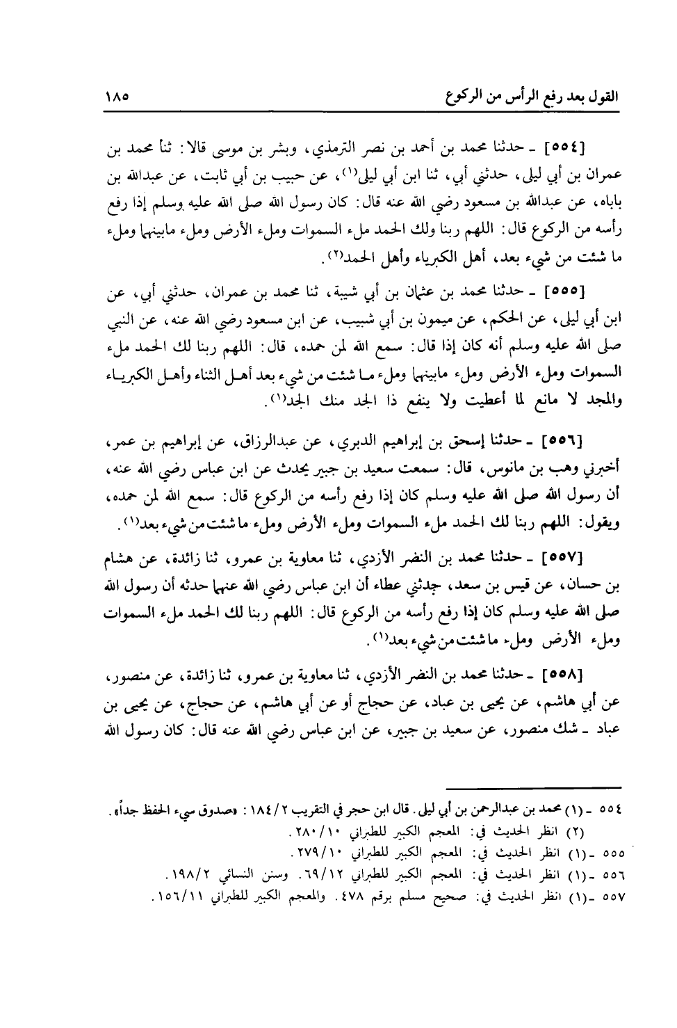 554 - حَدَّثَنَا مُحَمَّدُ بْنُ أَحْمَدَ بْنِ نَصْرٍ التِّرْمِذِيُّ، وَبِشْرُ بْنُ مُوسَى، قَالَا: ثنا مُحَمَّدُ بْنُ عِمْرَانَ بْنِ أَبِي لَيْلَى، حَدَّثَنِي أَبِي، ثنا ابْنُ أَبِي لَيْلَى، عَنْ حَبِيبِ بْنِ أَبِي ثَابِتٍ، عَنْ عَبْدِ اللَّهِ بْنِ بَابَاهِ، عَنْ عَبْدِ اللَّهِ بْنِ مَسْعُودٍ، رَضِيَ اللَّهُ عَنْهُ قَالَ: كَانَ رَسُولُ اللَّهِ صَلَّى اللهُ عَلَيْهِ وَسَلَّمَ إِذَا رَفَعَ رَأْسَهُ مِنَ الرُّكُوعِ قَالَ: «§اللَّهُمَّ رَبَّنَا وَلَكَ الْحَمْدُ، مِلْءَ السَّمَوَاتِ وَمِلْءَ الْأَرْضِ، وَمِلْءَ مَا بَيْنَهُمَا، وَمِلْءَ مَا شِئْتَ مِنْ شَيْءٍ بَعْدُ، أَهْلَ الْكِبْرِيَاءِ وَأَهْلَ الْحَمْدِ»
