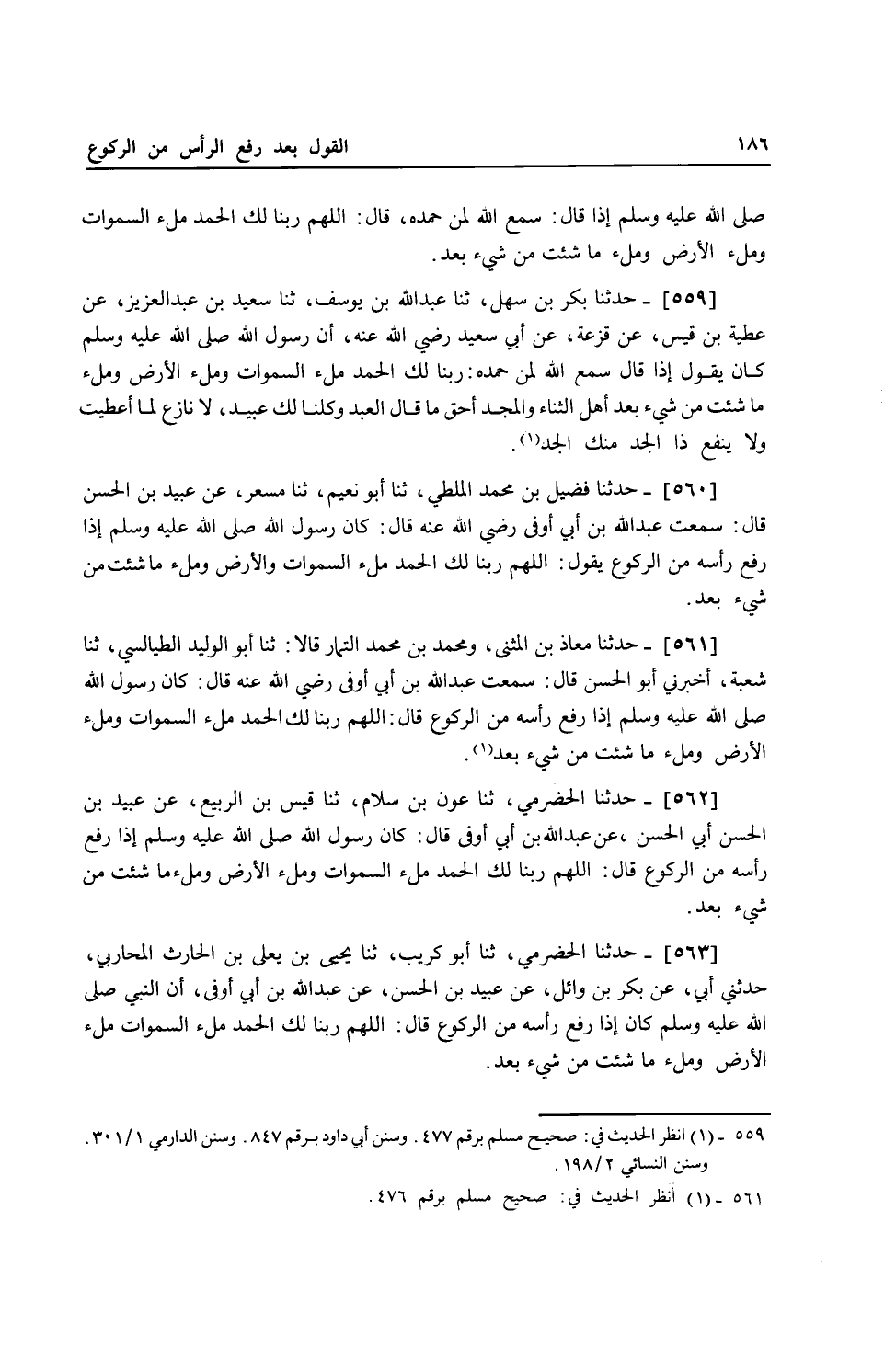 560 - حَدَّثَنَا فُضَيْلُ بْنُ مُحَمَّدٍ الْمَلَطِيُّ، ثنا أَبُو نُعَيْمٍ، ثنا مِسْعَرٌ، عَنْ عُبَيْدِ بْنِ الْحَسَنِ، قَالَ: سَمِعْتُ عَبْدَ اللَّهِ بْنَ أَبِي أَوْفَى، رَضِيَ اللَّهُ عَنْهُ قَالَ: كَانَ رَسُولُ اللَّهِ صَلَّى اللهُ عَلَيْهِ وَسَلَّمَ إِذَا رَفَعَ رَأْسَهُ مِنَ الرُّكُوعِ يَقُولُ: «§اللَّهُمَّ رَبَّنَا لَكَ الْحَمْدُ مِلْءَ السَّمَوَاتِ وَمِلْءَ الْأَرْضِ، وَمِلْءَ مَا شِئْتَ مِنْ شَيْءٍ بَعْدُ»