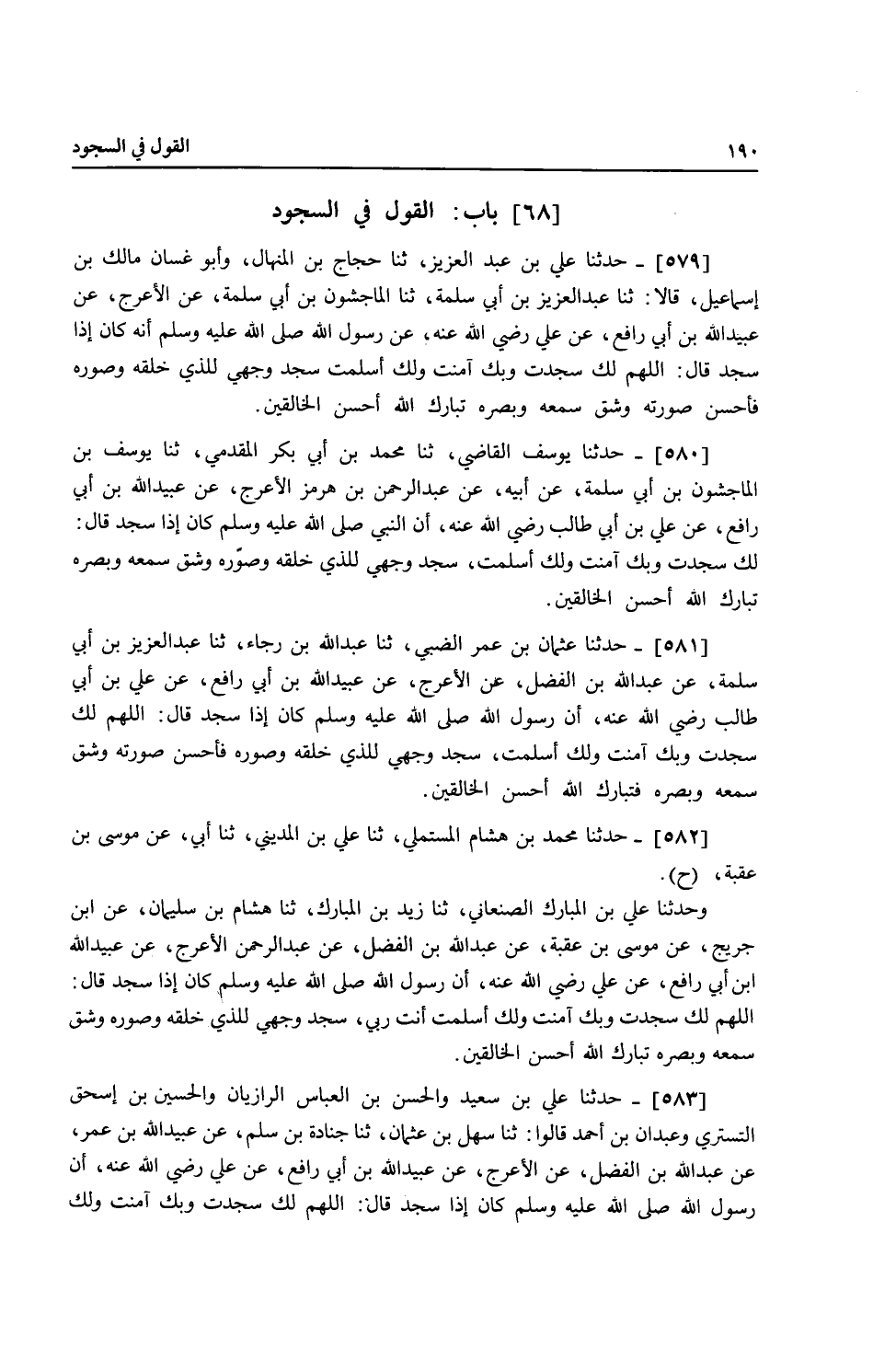 582 - حَدَّثَنَا مُحَمَّدُ بْنُ هِشَامٍ الْمُسْتَمْلِي، ثنا عَلِيُّ بْنُ الْمَدِينِيِّ، ثنا أَبِي، عَنْ مُوسَى بْنِ عُقْبَةَ، ح وَحَدَّثَنَا عَلِيُّ بْنُ الْمُبَارَكِ الصَّنْعَانِيُّ، ثنا زَيْدُ بْنُ الْمُبَارَكِ، ثنا هِشَامُ بْنُ سُلَيْمَانَ، عَنِ ابْنِ جُرَيْجٍ، عَنْ مُوسَى بْنِ عُقْبَةَ، عَنْ عَبْدِ اللَّهِ بْنِ الْفَضْلِ، عَنْ عَبْدِ الرَّحْمَنِ الْأَعْرَجِ، عَنْ عُبَيْدِ اللَّهِ بْنِ أَبِي رَافِعٍ، عَنْ عَلِيٍّ، رَضِيَ اللَّهُ عَنْهُ أَنَّ رَسُولَ اللَّهِ صَلَّى اللهُ عَلَيْهِ وَسَلَّمَ كَانَ إِذَا سَجَدَ قَالَ: «§اللَّهُمَّ لَكَ سَجَدْتُ، وَبِكَ آمَنْتُ، وَلَكَ أَسْلَمْتُ، أَنْتَ رَبِّي سَجَدَ وَجْهِي لِلَّذِي خَلَقَهُ وَصَوَّرَهُ وَشَقَّ سَمْعَهُ وَبَصَرَهُ، تَبَارَكَ اللَّهُ أَحْسَنُ الْخَالِقِينَ»