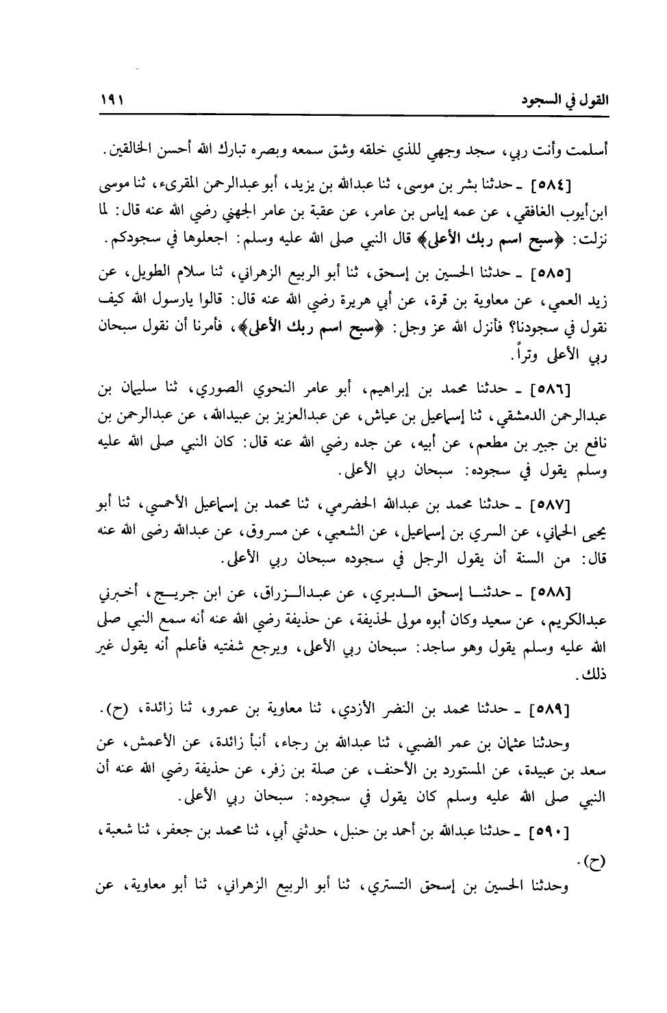 589 - حَدَّثَنَا مُحَمَّدُ بْنُ النَّضْرِ الْأَزْدِيُّ، ثنا مُعَاوِيَةُ بْنُ عَمْرٍو، ثنا زَائِدَةُ، ح وَحَدَّثَنَا عُثْمَانُ بْنُ عُمَرَ الضَّبِّيُّ، ثنا عَبْدُ اللَّهِ بْنُ رَجَاءٍ، أَنْبَأَ زَائِدَةُ، عَنِ الْأَعْمَشِ، عَنْ سَعْدِ بْنِ عُبَيْدَةَ، عَنِ الْمُسْتَوْرِدِ بْنِ الْأَحْنَفِ، عَنْ صِلَةَ بْنِ زُفَرَ، عَنْ حُذَيْفَةَ، رَضِيَ اللَّهُ عَنْهُ أَنَّ النَّبِيَّ صَلَّى اللهُ عَلَيْهِ وَسَلَّمَ كَانَ يَقُولُ فِي سُجُودِهِ: «§سُبْحَانَ رَبِّيَ الْأَعْلَى»