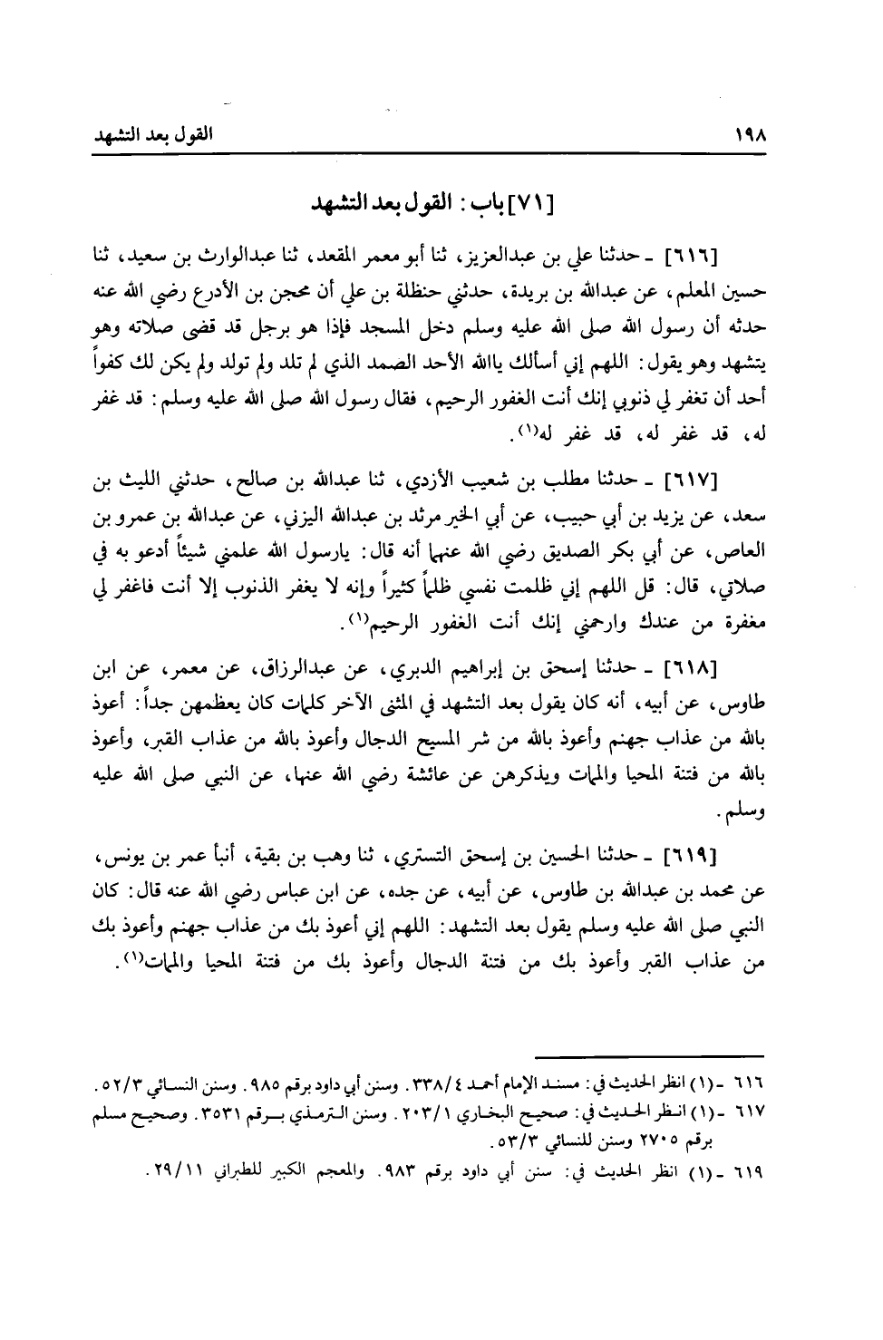 618 - حَدَّثَنَا إِسْحَاقُ بْنُ إِبْرَاهِيمَ الدَّبَرِيُّ، عَنْ عَبْدِ الرَّزَّاقِ، عَنْ مَعْمَرٍ، عَنِ ابْنِ طَاوُسٍ، عَنْ أَبِيهِ، أَنَّهُ كَانَ يَقُولُ بَعْدَ التَّشَهُّدِ فِي الْمُثَنَّى الْآخِرِ كَلِمَاتٍ كَانَ يُعَظِّمُهُنَّ جِدًّا: «§أَعُوذُ بِاللَّهِ مِنْ عَذَابِ جَهَنَّمَ، وَأَعُوذُ بِاللَّهِ مِنْ شَرِّ الْمَسِيحِ الدَّجَّالِ، وَأَعُوذُ بِاللَّهِ مِنْ عَذَابِ الْقَبْرِ، وَأَعُوذُ بِاللَّهِ مِنْ فِتْنَةِ الْمَحْيَا وَالْمَمَاتِ» ، وَيَذْكُرُهُنَّ عَنْ عَائِشَةَ رَضِيَ اللَّهُ عَنْهَا عَنِ النَّبِيِّ صَلَّى اللهُ عَلَيْهِ وَسَلَّمَ