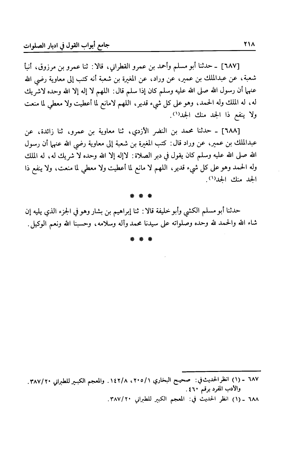 687 - حَدَّثَنَا أَبُو مُسْلِمٍ، وَأَحْمَدُ بْنُ عَمْرٍو الْقَطِرَانِيُّ، قَالَا: ثنا عَمْرُو بْنُ مَرْزُوقٍ، أَنْبَأَ شُعْبَةُ، عَنْ عَبْدِ الْمَلِكِ بْنِ عُمَيْرٍ، عَنْ وَرَّادٍ، عَنِ الْمُغِيرَةِ بْنِ شُعْبَةَ، أَنَّهُ كَتَبَ إِلَى مُعَاوِيَةَ رَضِيَ اللَّهُ عَنْهُمَا أَنَّ رَسُولَ اللَّهِ صَلَّى اللهُ عَلَيْهِ وَسَلَّمَ كَانَ §إِذَا سَلَّمَ قَالَ: «لَا إِلَهَ إِلَّا اللَّهُ وَحْدَهُ لَا شَرِيكَ لَهُ، لَهُ الْمُلْكُ وَلَهُ الْحَمْدُ وَهُوَ عَلَى كُلِّ شَيْءٍ قَدِيرٌ، اللَّهُمَّ لَا مَانِعَ لِمَا أَعْطَيْتَ، وَلَا مُعْطِيَ لِمَا مَنَعْتَ، وَلَا يَنْفَعُ ذَا الْجَدِّ مِنْكَ الْجَدُّ»