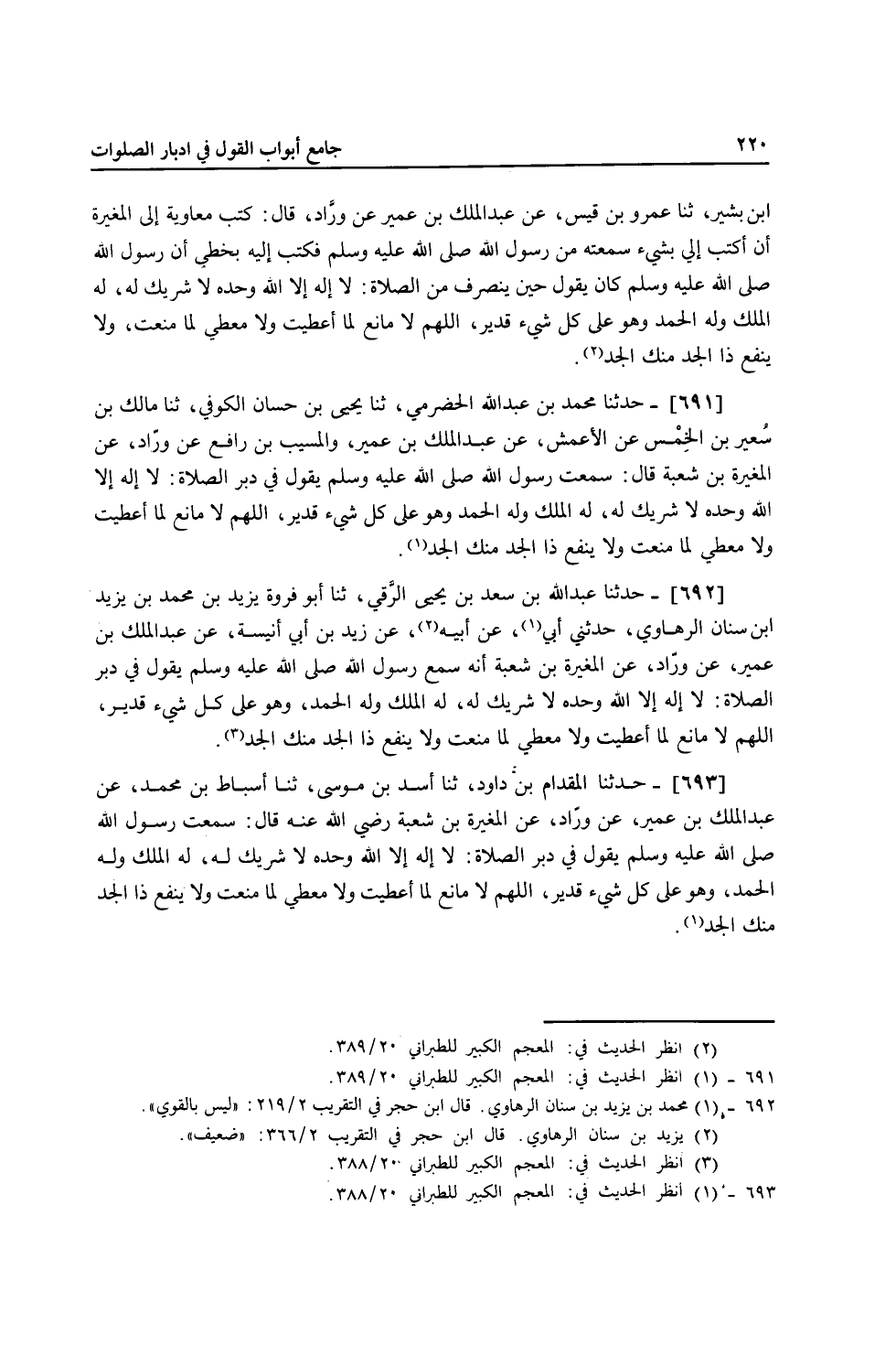 691 - حَدَّثَنَا مُحَمَّدُ بْنُ عَبْدِ اللَّهِ الْحَضْرَمِيُّ، ثنا يَحْيَى بْنُ حَسَّانَ الْكُوفِيُّ، ثنا مَالِكُ بْنُ سُعَيْرِ بْنِ الْخِمْسِ، عَنِ الْأَعْمَشِ، عَنْ عَبْدِ الْمَلِكِ بْنِ عُمَيْرٍ، وَالْمُسَيَّبُ بْنُ رَافِعٍ، عَنْ وَرَّادٍ، عَنِ الْمُغِيرَةِ بْنِ شُعْبَةَ، قَالَ: سَمِعْتُ رَسُولَ اللَّهِ صَلَّى اللهُ عَلَيْهِ وَسَلَّمَ يَقُولُ فِي دُبُرِ الصَّلَاةِ: «§لَا إِلَهَ إِلَّا اللَّهُ وَحْدَهُ لَا شَرِيكَ لَهُ، لَهُ الْمُلْكُ وَلَهُ الْحَمْدُ وَهُوَ عَلَى كُلِّ شَيْءٍ قَدِيرٌ، اللَّهُمَّ لَا مَانِعَ لِمَا أَعْطَيْتَ، وَلَا مُعْطِيَ لِمَا مَنَعْتَ، وَلَا يَنْفَعُ ذَا الْجَدِّ مِنْكَ الْجَدُّ»