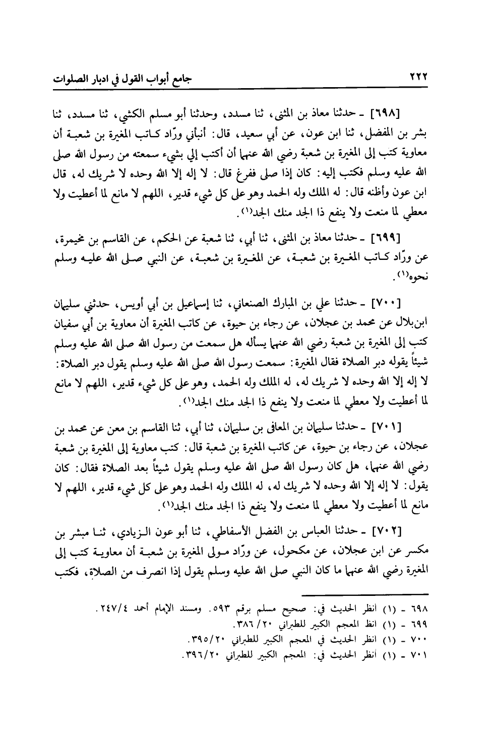 698 - حَدَّثَنَا مُعَاذُ بْنُ الْمُثَنَّى، ثنا مُسَدَّدٌ، وَحَدَّثَنَا أَبُو مُسْلِمٍ الْكَشِّيُّ، ثنا مُسَدَّدٌ، ثنا بِشْرُ بْنُ الْمُفَضَّلِ، ثنا ابْنُ عَوْنٍ، عَنْ أَبِي سَعِيدٍ، قَالَ: أَنْبَأَنِي وَرَّادٌ كَاتِبُ الْمُغِيرَةِ بْنِ شُعْبَةَ أَنَّ مُعَاوِيَةَ، كَتَبَ إِلَى الْمُغِيرَةِ بْنِ شُعْبَةَ رَضِيَ اللَّهُ عَنْهُمَا أَنِ اكْتُبْ إِلَيَّ بِشَيْءٍ سَمِعْتَهُ مِنْ رَسُولِ اللَّهِ صَلَّى اللهُ عَلَيْهِ وَسَلَّمَ، فَكَتَبَ إِلَيْهِ كَانَ إِذَا صَلَّى فَفَرَغَ قَالَ: " §لَا إِلَهَ إِلَّا اللَّهُ وَحْدَهُ لَا شَرِيكَ لَهُ قَالَ ابْنُ عَوْنٍ: وَأَظُنُّهُ قَالَ: لَهُ الْمُلْكُ وَلَهُ الْحَمْدُ وَهُوَ عَلَى كُلِّ شَيْءٍ قَدِيرٌ، اللَّهُمَّ لَا مَانِعَ لِمَا أَعْطَيْتَ، وَلَا مُعْطِيَ لِمَا مَنَعْتَ، وَلَا يَنْفَعُ ذَا الْجَدِّ مِنْكَ الْجَدُّ "