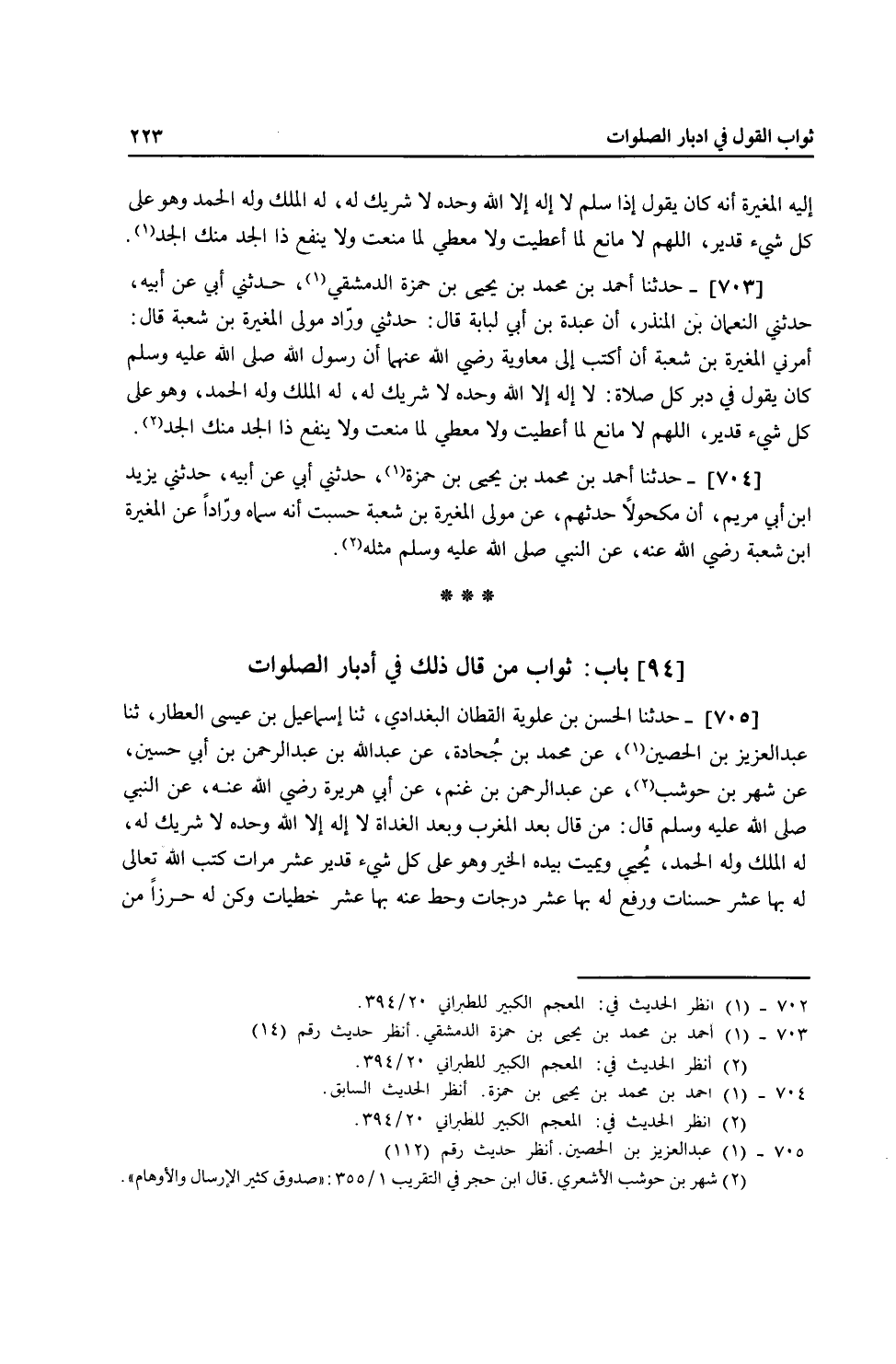 703 - حَدَّثَنَا أَحْمَدُ بْنُ مُحَمَّدِ بْنِ يَحْيَى بْنِ حَمْزَةَ الدِّمَشْقِيُّ، حَدَّثَنِي أَبِي، عَنْ أَبِيهِ، حَدَّثَنِي النُّعْمَانُ بْنُ الْمُنْذِرِ، أَنَّ عَبْدَةَ بْنَ أَبِي لُبَابَةَ، قَالَ: حَدَّثَنِي وَرَّادٌ مَوْلَى الْمُغِيرَةِ بْنِ شُعْبَةَ قَالَ: أَمَرَنِي الْمُغِيرَةُ بْنُ شُعْبَةَ أَنْ أَكْتُبَ إِلَى مُعَاوِيَةَ رَضِيَ اللَّهُ عَنْهُمَا أَنَّ رَسُولَ اللَّهِ صَلَّى اللهُ عَلَيْهِ وَسَلَّمَ كَانَ §يَقُولُ فِي دُبُرِ كُلِّ صَلَاةٍ: «لَا إِلَهَ إِلَّا اللَّهُ وَحْدَهُ لَا شَرِيكَ لَهُ، لَهُ الْمُلْكُ وَلَهُ الْحَمْدُ وَهُوَ عَلَى كُلِّ شَيْءٍ قَدِيرٌ، اللَّهُمَّ لَا مَانِعَ لِمَا أَعْطَيْتَ، وَلَا مُعْطِيَ لِمَا مَنَعْتَ، وَلَا يَنْفَعُ ذَا الْجَدِّ مِنْكَ الْجَدُّ»