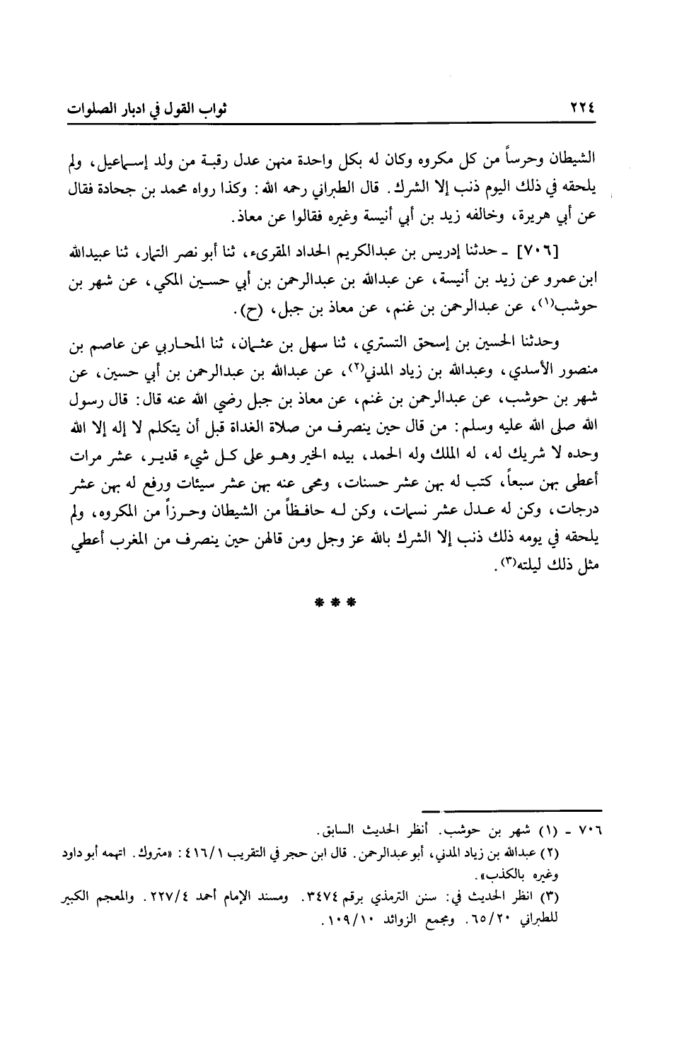 706 - حَدَّثَنَا إِدْرِيسُ بْنُ عَبْدِ الْكَرِيمِ الْحَدَّادُ الْمُقْرِئُ، ثنا أَبُو نَصْرٍ التَّمَّارُ، ثنا عُبَيْدُ اللَّهِ بْنُ عَمْرٍو، عَنْ زَيْدِ بْنِ أَبِي أُنَيْسَةَ، عَنْ عَبْدِ اللَّهِ بْنِ عَبْدِ الرَّحْمَنِ بْنِ أَبِي حُسَيْنٍ الْمَكِّيِّ، عَنْ شَهْرِ بْنِ حَوْشَبٍ، عَنْ عَبْدِ الرَّحْمَنِ بْنِ غَنْمٍ، عَنْ مُعَاذِ بْنِ جَبَلٍ، ح وَحَدَّثَنَا الْحُسَيْنُ بْنُ إِسْحَاقَ التُّسْتَرِيُّ، ثنا سَهْلُ بْنُ عُثْمَانَ، ثنا الْمُحَارِبِيُّ، عَنْ عَاصِمِ بْنِ مَنْصُورٍ الْأَسَدِيِّ، وَعَبْدِ اللَّهِ بْنِ زِيَادٍ الْمَدَنِيِّ، عَنْ عَبْدِ اللَّهِ بْنِ عَبْدِ الرَّحْمَنِ بْنِ أَبِي حُسَيْنٍ، عَنْ شَهْرِ بْنِ حَوْشَبٍ، عَنْ عَبْدِ الرَّحْمَنِ بْنِ غَنْمٍ، عَنْ مُعَاذِ بْنِ جَبَلٍ، رَضِيَ اللَّهُ عَنْهُ قَالَ: قَالَ رَسُولُ اللَّهِ صَلَّى اللهُ عَلَيْهِ وَسَلَّمَ: " §مَنْ قَالَ حِينَ يَنْصَرِفُ مِنْ صَلَاةِ الْغَدَاةِ قَبْلَ أَنْ يَتَكَلَّمَ: لَا إِلَهَ إِلَّا اللَّهُ وَحْدَهُ لَا شَرِيكَ لَهُ، لَهُ الْمُلْكُ، وَلَهُ الْحَمْدُ بِيَدِهِ الْخَيْرُ وَهُوَ عَلَى كُلِّ شَيْءٍ قَدِيرٌ عَشْرَ مَرَّاتٍ أُعْطِيَ بِهِنَّ سَبْعًا: كُتِبَ لَهُ بِهِنَّ عَشْرُ حَسَنَاتٍ، وَمُحِيَ عَنْهُ بِهِنَّ عَشْرُ سَيِّئَاتٍ، وَرُفِعَ لَهُ بِهِنَّ عَشْرُ دَرَجَاتٍ، وَكُنَّ لَهُ عَدْلُ عَشْرِ نَسَمَاتٍ، وَكُنَّ لَهُ حَافِظًا مِنَ الشَّيْطَانِ، وَحِرْزًا مِنَ الْمَكْرُوهِ، وَلَمْ يَلْحَقْهُ فِي يَوْمِهِ ذَلِكَ ذَنْبٌ إِلَّا الشِّرْكُ بِاللَّهِ عَزَّ وَجَلَّ، وَمَنْ قَالَهُنَّ حِينَ يَنْصَرِفُ مِنَ الْمَغْرِبِ أُعْطِيَ مِثْلُ ذَلِكَ لَيْلَتَهُ "