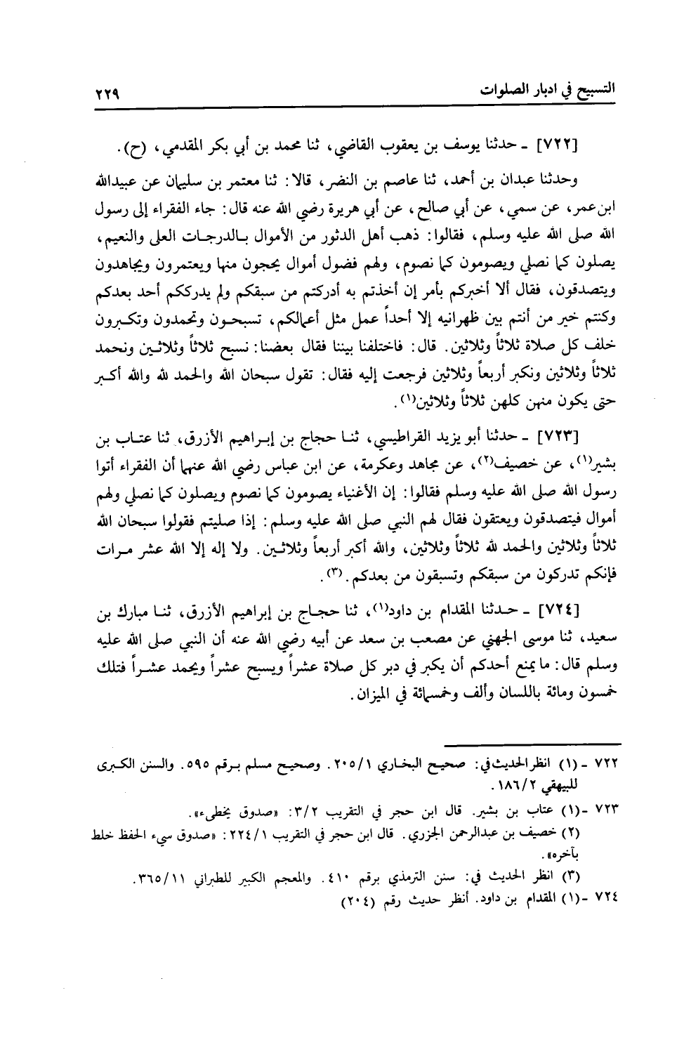 722 - حَدَّثَنَا يُوسُفُ بْنُ يَعْقُوبَ الْقَاضِي، ثنا مُحَمَّدُ بْنُ أَبِي بَكْرٍ الْمُقَدَّمِيُّ، ح وَحَدَّثَنَا عَبْدَانُ بْنُ أَحْمَدَ، ثنا عَاصِمُ بْنُ النَّضْرِ، قَالَا: ثنا مُعْتَمِرُ بْنُ سُلَيْمَانَ، عَنْ عُبَيْدِ اللَّهِ بْنِ عُمَرَ، عَنْ سُمَيٍّ، عَنْ أَبِي صَالِحٍ، عَنْ أَبِي هُرَيْرَةَ، رَضِيَ اللَّهُ عَنْهُ قَالَ: جَاءَ الْفُقَرَاءُ إِلَى رَسُولِ اللَّهِ صَلَّى اللهُ عَلَيْهِ وَسَلَّمَ فَقَالُوا: ذَهَبَ أَهْلُ الدُّثُورِ مِنَ الْأَمْوَالِ بِالدَّرَجَاتِ الْعُلَى وَالنَّعِيمِ، يُصَلُّونَ كَمَا نُصَلِّي، وَيَصُومُونَ كَمَا نَصُومُ وَلَهُمْ فُضُولُ أَمْوَالٍ يَحُجُّونَ مِنْهَا وَيَعْتَمِرُونَ، وَيُجَاهِدُونَ وَيَتَصَدَّقُونَ، فَقَالَ: «أَلَا أُخْبِرُكُمْ بِأَمْرٍ إِنْ أَخَذْتُمْ بِهِ أَدْرَكْتُمْ مَنْ سَبَقَكُمْ، وَلَمْ يُدْرِكْكُمْ أَحَدٌ بَعْدَكُمْ، وَكُنْتُمْ خَيْرَ مَنْ أَنْتُمْ بَيْنَ ظَهْرَانَيْهِ إِلَّا أَحَدًا عَمِلَ مِثْلَ أَعْمَالِكُمْ، §تُسَبِّحُونَ، وَتَحْمَدُونَ، وَتُكَبِّرُونَ خَلْفَ كُلِّ صَلَاةٍ ثَلَاثًا وَثَلَاثِينَ» ، قَالَ: فَاخْتَلَفْنَا بَيْنَنَا فَقَالَ بَعْضُنَا: نُسَبِّحُ ثَلَاثًا وَثَلَاثِينَ وَنَحْمَدُ ثَلَاثًا وَثَلَاثِينَ وَنُكَبِّرُ أَرْبَعًا وَثَلَاثِينَ، فَرَجَعْتُ إِلَيْهِ فَقَالَ: " تَقُولُ: سُبْحَانَ اللَّهِ، وَالْحَمْدُ لِلَّهِ، وَاللَّهُ أَكْبَرُ، حَتَّى يَكُونَ مِنْهُنَّ كُلُّهُنَّ ثَلَاثًا وَثَلَاثِينَ "