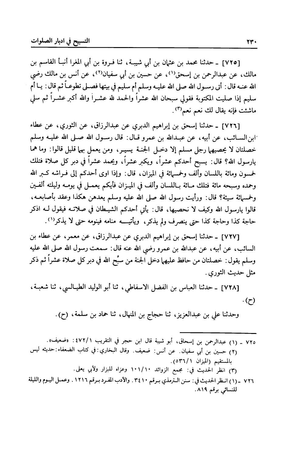 727 - حَدَّثَنَا إِسْحَاقُ بْنُ إِبْرَاهِيمَ الدَّبَرِيُّ، عَنْ عَبْدِ الرَّزَّاقِ، عَنِ الثَّوْرِيِّ، عَنْ عَطَاءِ بْنِ السَّائِبِ، عَنْ أَبِيهِ، عَنْ عَبْدِ اللَّهِ بْنِ عَمْرٍو، قَالَ: قَالَ رَسُولُ اللَّهِ صَلَّى اللهُ عَلَيْهِ وَسَلَّمَ: «§خَصْلَتَانِ لَا يُحْصِيهِمَا رَجُلٌ مُسْلِمٌ إِلَّا دَخَلَ الْجَنَّةَ وَهُمَا يَسِيرٌ، وَمَنْ يَعْمَلُ بِهِمَا قَلِيلٌ» قَالُوا: وَمَا هُمَا يَا رَسُولَ اللَّهِ؟ قَالَ: «يُسَبِّحُ أَحَدُكُمْ عَشْرًا، وَيُكَبِّرُ عَشْرًا، وَيَحْمَدُ عَشْرًا فِي دُبُرِ كُلِّ صَلَاةٍ، فَتِلْكَ خَمْسُونَ وَمِائَةٌ بِاللِّسَانِ وَأَلْفٌ وَخَمْسُمِائَةٍ فِي الْمِيزَانِ» قَالَ: «وَإِذَا أَوَى أَحَدُكُمْ إِلَى فِرَاشِهِ كَبَّرَ اللَّهَ وَحَمِدَهُ وَسَبَّحَهُ مِائَةً فَتِلْكَ مِائَةٌ بِاللِّسَانِ وَأَلْفٌ فِي الْمِيزَانِ، فَأَيُّكُمْ يَعْمَلُ فِي يَوْمِهِ وَلَيْلَتِهِ أَلْفَيْنِ وَخَمْسُمِائَةِ سَيِّئَةٍ» قَالَ وَرَأَيْتُ رَسُولَ اللَّهِ صَلَّى اللهُ عَلَيْهِ وَسَلَّمَ يَعُدُّهُنَّ هَكَذَا وَعَقَدَ بِأُصَابِعِهِ، قَالُوا: يَا رَسُولَ اللَّهِ وَكَيْفَ لَا نُحْصِيهَا؟ قَالَ: " يَأْتِي أَحَدُكُمُ الشَّيْطَانُ فِي صَلَاتِهِ فَيَقُولُ لَهُ: اذْكُرْ حَاجَةَ كَذَا وَحَاجَةَ كَذَا، حَتَّى يَنْصَرِفَ وَلَمْ يَذْكُرْ، وَيَأْتِيهِ عِنْدَ مَنَامَهُ فَيُنَوِّمُهُ حَتَّى لَا يَذْكُرَ " حَدَّثَنَا إِسْحَاقُ بْنُ إِبْرَاهِيمَ الدَّبَرِيُّ، عَنْ عَبْدِ الرَّزَّاقِ، عَنْ مَعْمَرٍ، عَنْ عَطَاءِ بْنِ السَّائِبِ، عَنْ أَبِيهِ، عَنْ عَبْدِ اللَّهِ بْنِ عَمْرٍو، رَضِيَ اللَّهُ عَنْهُ قَالَ: سَمِعْتُ رَسُولَ اللَّهِ صَلَّى اللهُ عَلَيْهِ وَسَلَّمَ يَقُولُ: " خَصْلَتَانِ مَنْ حَافَظَ عَلَيْهِمَا دَخَلَ الْجَنَّةَ: مَنْ سَبَّحَ اللَّهَ فِي دُبُرِ كُلِّ صَلَاةٍ عَشْرًا " ثُمَّ ذَكَرَ مِثْلَ حَدِيثِ الثَّوْرِيِّ حَدَّثَنَا الْعَبَّاسُ بْنُ الْفَضْلِ الْأَسْفَاطِيُّ، ثنا أَبُو الْوَلِيدِ الطَّيَالِسِيُّ، ثنا شُعْبَةُ، ح وَحَدَّثَنَا عَلِيُّ بْنُ عَبْدِ الْعَزِيزِ، ثنا حَجَّاجُ بْنُ الْمِنْهَالِ، ثنا حَمَّادُ بْنُ سَلَمَةَ، ح وَحَدَّثَنَا عَلِيُّ بْنُ عَبْدِ الْعَزِيزِ، ثنا عَارِمٌ أَبُو النُّعْمَانِ، ثنا حَمَّادُ بْنُ زَيْدٍ، ح وَحَدَّثَنَا الْمِقْدَامُ بْنُ دَاوُدَ، ثنا عَبْدُ اللَّهِ بْنُ مُحَمَّدِ بْنِ الْمُغِيرَةِ، ثنا مِسْعَرُ بْنُ كِدَامٍ، ح وَحَدَّثَنَا أَبُو يَزِيدَ الْقَرَاطِيسِيُّ، ثنا يَعْقُوبُ بْنُ أَبِي عَبَّادٍ الْمَكِّيُّ، ثنا إِبْرَاهِيمُ بْنُ طَهْمَانَ، ح وَحَدَّثَنَا مُحَمَّدُ بْنُ النَّضْرِ الْأَزْدِيُّ، ثنا مُعَاوِيَةُ بْنُ عَمْرٍو، ثنا زَائِدَةُ، ح وَحَدَّثَنَا عَمْرُو بْنُ أَبِي الطَّاهِرِ بْنُ السَّرْحِ الْمِصْرِيُّ، ثنا يُوسُفُ بْنُ عَدِيٍّ، ثنا أَبُو الْأَحْوَصِ، ح وَحَدَّثَنَا عُمَرُ بْنُ حَفْصٍ السَّدُوسِيُّ، ثنا عَاصِمُ بْنُ عَلِيٍّ السَّدُوسِيُّ، ح وَحَدَّثَنَا الْحُسَيْنُ بْنُ إِسْحَاقَ التُّسْتَرِيُّ، ثنا يَحْيَى الْحِمَّانِيُّ، ثنا أَبُو بَكْرٍ النَّهْشَلِيُّ، وَأَبُو إِسْحَاقَ الْحُمَيْسِيُّ ح وَحَدَّثَنَا مُحَمَّدُ بْنُ عَلِيِّ بْنِ الْأَحْمَرِ النَّاقِدُ، ثنا مُحَمَّدُ بْنُ فِرَاسٍ أَبُو هُرَيْرَةَ الصَّيْرَفِيُّ، ثنا أَبُو دَاوُدَ، عَنْ وَرْقَاءَ بْنِ عُمَرَ الْيَشْكُرِيِّ، ح وَحَدَّثَنَا الْمِقْدَامُ بْنُ دَاوُدَ، ثنا أَسَدُ بْنُ مُوسَى، ثنا أَبُو خَالِدٍ الْأَحْمَرُ، عَنْ إِسْمَاعِيلَ بْنِ أَبِي خَالِدٍ، ح وَحَدَّثَنَا الْوَلِيدُ بْنُ الْعَبَّاسِ الْمِصْرِيُّ، ثنا حَامِدُ بْنُ يَحْيَى الْبَلْخِيُّ، ثنا سُفْيَانُ بْنُ عُيَيْنَةَ، كُلُّهُمْ عَنْ عَطَاءِ بْنِ السَّائِبِ، عَنْ أَبِيهِ، عَنْ عَبْدِ اللَّهِ بْنِ عَمْرٍو، رَضِيَ 