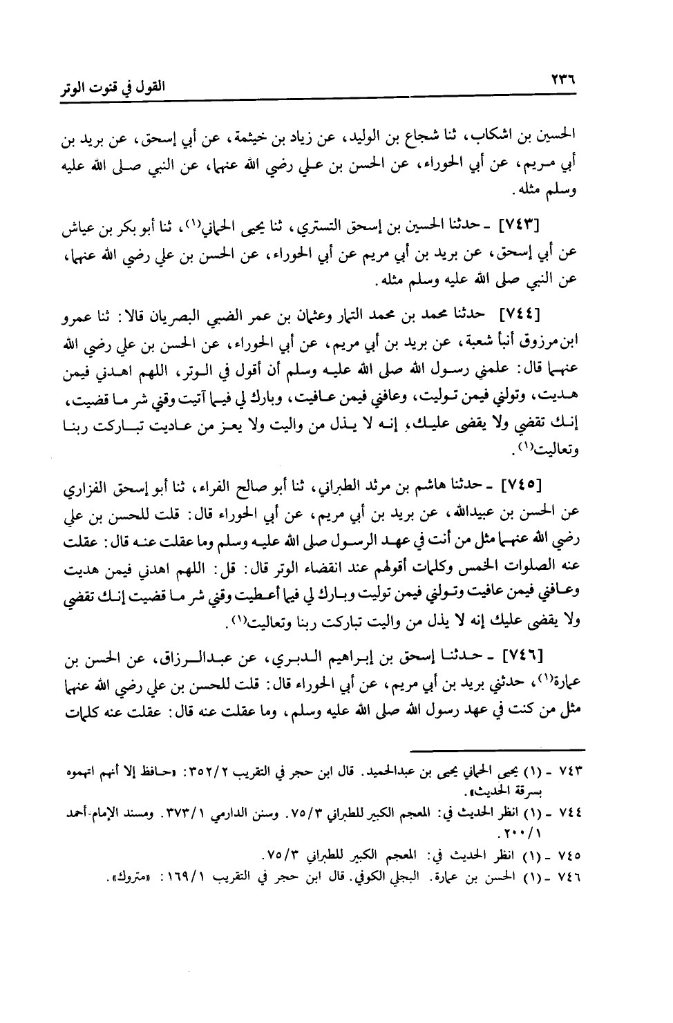 745 - حَدَّثَنَا هَاشِمُ بْنُ مَرْثَدٍ الطَّبَرَانِيُّ، ثنا أَبُو صَالِحٍ الْفَرَّاءُ، ثنا أَبُو إِسْحَاقَ الْفَزَارِيُّ، عَنِ الْحَسَنِ بْنِ عُبَيْدِ اللَّهِ، عَنْ بُرَيْدِ بْنِ أَبِي مَرْيَمَ، عَنْ أَبِي الْحَوْرَاءِ، قَالَ: قُلْتُ لِلْحَسَنِ بْنِ عَلِيٍّ رَضِيَ اللَّهُ عَنْهُمَا: مِثْلُ مَنْ أَنْتَ فِي عَهْدِ الرَّسُولِ صَلَّى اللهُ عَلَيْهِ وَسَلَّمَ وَمَا عَقَلْتَ عَنْهُ؟ قَالَ: عَقَلْتُ عَنْهُ الصَّلَوَاتِ الْخَمْسَ وَكَلِمَاتٍ أَقُولُهُمْ عِنْدَ انْقِضَاءِ الْوِتْرِ، قَالَ: " §قُلِ: اللَّهُمَّ اهْدِنِي فِيمَنْ هَدَيْتَ، وَعَافِنِي فِيمَنْ عَافَيْتَ، وَتَوَلَّنِي فِيمَنْ تَوَلَّيْتَ، وَبَارِكْ لِي فِيمَا أَعْطَيْتَ، وَقِنِي شَرَّ مَا قَضَيْتَ، إِنَّكَ تَقْضِي وَلَا يُقْضَى عَلَيْكَ، إِنَّهُ لَا يَذِلُّ مَنْ وَالَيْتَ، تَبَارَكْتَ رَبَّنَا وَتَعَالَيْتَ "