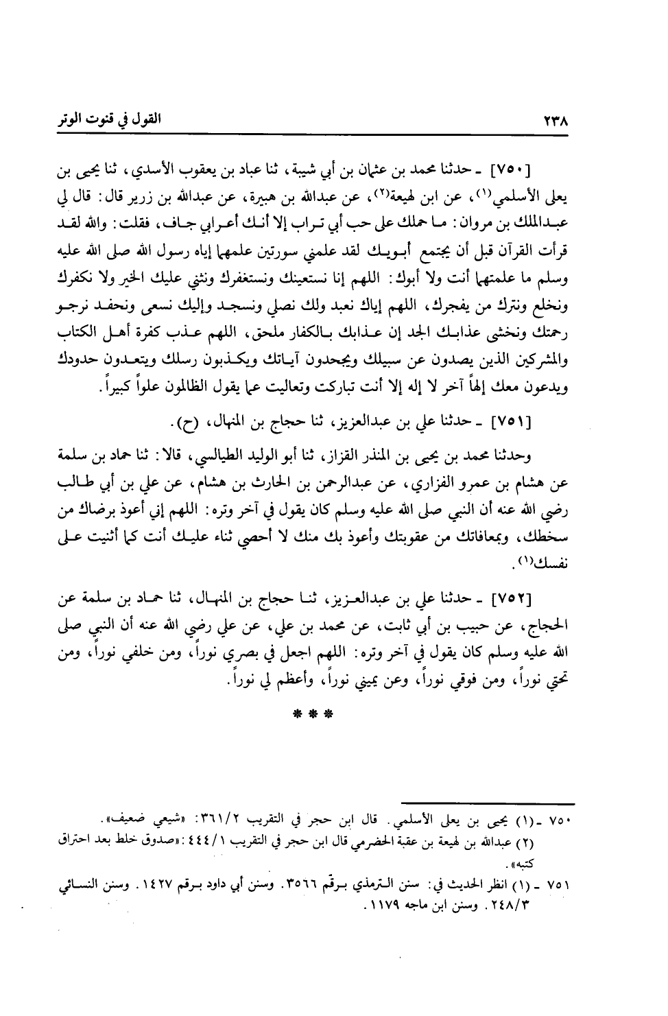 751 - حَدَّثَنَا عَلِيُّ بْنُ عَبْدِ الْعَزِيزِ، ثنا حَجَّاجُ بْنُ الْمِنْهَالِ، ح وَحَدَّثَنَا مُحَمَّدُ بْنُ يَحْيَى بْنِ الْمُنْذِرِ الْقَزَّازُ، ثنا أَبُو الْوَلِيدِ الطَّيَالِسِيُّ، قَالَا: ثنا حَمَّادُ بْنُ سَلَمَةَ، عَنْ هِشَامِ بْنِ عَمْرٍو الْفَزَارِيُّ، عَنْ عَبْدِ الرَّحْمَنِ بْنِ الْحَارِثِ بْنِ هِشَامٍ، عَنْ عَلِيِّ بْنِ أَبِي طَالِبٍ، رَضِيَ اللَّهُ عَنْهُ أَنَّ النَّبِيَّ صَلَّى اللهُ عَلَيْهِ وَسَلَّمَ كَانَ يَقُولُ فِي آخِرِ وِتْرِهِ: «§اللَّهُمَّ إِنِّي أَعُوذُ بِرِضَاكَ مِنْ سَخَطِكَ، وَبِمُعَافَاتِكَ مِنْ عُقُوبَتِكَ، وَأَعُوذُ بِكَ مِنْكَ، لَا أُحْصِي ثَنَاءً عَلَيْكَ، أَنْتَ كَمَا أَثْنَيْتَ عَلَى نَفْسِكَ»