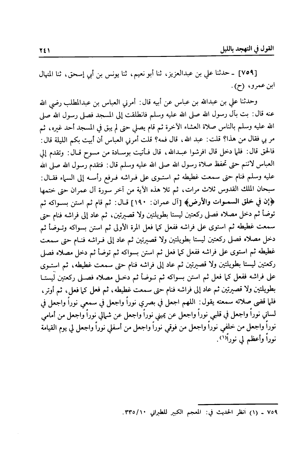 759 - حَدَّثَنَا عَلِيُّ بْنُ عَبْدِ الْعَزِيزِ، ثنا أَبُو نُعَيْمٍ، ثنا يُونُسُ بْنُ أَبِي إِسْحَاقَ، ثنا الْمِنْهَالُ بْنُ عَمْرٍو، ح وَحَدَّثَنَا عَلِيُّ بْنُ عَبْدِ اللَّهِ بْنِ عَبَّاسٍ، عَنْ أَبِيهِ، قَالَ: أَمَرَنِي الْعَبَّاسُ بْنُ عَبْدِ الْمُطَّلِبِ رَضِيَ اللَّهُ عَنْهُ قَالَ: بِتْ بِآلِ رَسُولِ اللَّهِ صَلَّى اللهُ عَلَيْهِ وَسَلَّمَ، فَانْطَلَقْتُ إِلَى الْمَسْجِدِ، فَصَلَّى رَسُولُ اللَّهِ، صَلَّى اللهُ عَلَيْهِ وَسَلَّمَ بِالنَّاسِ صَلَاةَ الْعِشَاءِ الْآخِرَةِ ثُمَّ قَامَ يُصَلِّي حَتَّى لَمْ يَبْقَ فِي الْمَسْجِدِ أَحَدٌ غَيْرُهُ، ثُمَّ مَرَّ بِي، فَقَالَ: «مَنْ هَذَا؟» قُلْتُ: عَبْدُ اللَّهِ، قَالَ: فَمَهْ؟ " قُلْتُ: أَمَرَنِي الْعَبَّاسُ أَنْ أَبِيتَ بِكُمُ اللَّيْلَةَ، قَالَ: «فَالْحَقْ» قَالَ: فَلَمَّا دَخَلَ قَالَ: «أَفْرِشُوا عَبْدَ اللَّهِ» قَالَ: فَأُتِيتُ بِوِسَادَةٍ مِنْ مُسُوحٍ، قَالَ: وَتَقَدَّمَ إِلَيَّ الْعَبَّاسُ: لَا تَنَمْ حَتَّى تَحْفَظَ صَلَاةَ رَسُولِ اللَّهِ صَلَّى اللهُ عَلَيْهِ وَسَلَّمَ، قَالَ: فَتَقَدَّمَ رَسُولُ اللَّهِ صَلَّى اللهُ عَلَيْهِ وَسَلَّمَ فَنَامَ حَتَّى سَمِعْتُ غَطِيطَهُ، ثُمَّ اسْتَوَى عَلَى فِرَاشِهِ فَرَفَعَ رَأْسَهُ إِلَى السَّمَاءِ، فَقَالَ: «§سُبْحَانَ الْمَلِكِ الْقُدُّوسِ» ثَلَاثَ مَرَّاتٍ، ثُمَّ تَلَا هَذِهِ الْآيَةَ مِنْ آخِرِ سُورَةِ آلِ عِمْرَانَ حَتَّى خَتَمَهَا {إِنَّ فِي خَلْقِ السَّمَوَاتِ وَالْأَرْضِ} قَالَ: ثُمَّ قَامَ ثُمَّ اسْتَنَّ بِسِوَاكِهِ، ثُمَّ تَوَضَّأَ، ثُمَّ دَخَلَ مُصَلَّاهُ، فَصَلَّى رَكْعَتَيْنِ لَيْسَتَا بِطَوِيلَتَيْنِ وَلَا قَصِيرَتَيْنِ، ثُمَّ عَادَ إِلَى فِرَاشِهِ، فَنَامَ حَتَّى سَمِعْتُ غَطِيطَهُ، ثُمَّ اسْتَوَى عَلَى فِرَاشِهِ فَفَعَلَ كَمَا فَعَلَ الْمَرَّةَ الْأُولَى، ثُمَّ اسْتَنَّ بِسِوَاكِهِ وَتَوَضَّأَ، ثُمَّ دَخَلَ مُصَلَّاهُ فَصَلَّى رَكْعَتَيْنِ لَيْسَتَا بِطَوِيلَتَيْنِ وَلَا قَصِيرَتَيْنِ، ثُمَّ عَادَ إِلَى فِرَاشِهِ فَنَامَ حَتَّى سَمِعْتُ غَطِيطَهُ، ثُمَّ اسْتَوَى عَلَى فِرَاشِهِ فَفَعَلَ كَمَا فَعَلَ، ثُمَّ اسْتَنَّ بِسِوَاكِهِ، ثُمَّ تَوَضَّأَ ثُمَّ دَخَلَ مُصَلَّاهُ فَصَلَّى رَكْعَتَيْنِ لَيْسَتَا بِطَوِيلَتَيْنِ وَلَا قَصِيرَتَيْنِ ثُمَّ عَادَ إِلَى فِرَاشِهِ فَنَامَ حَتَّى سَمِعْتُ غَطِيطَهُ، ثُمَّ اسْتَوَى عَلَى فِرَاشِهِ فَفَعَلَ كَمَا فَعَلَ، ثُمَّ اسْتَنَّ بِسِوَاكِهِ، ثُمَّ تَوَضَّأَ ثُمَّ دَخَلَ مُصَلَّاهُ فَصَلَّى رَكْعَتَيْنِ لَيْسَتَا بِطَوِيلَتَيْنِ وَلَا قَصِيرَتَيْنِ ثُمَّ عَادَ إِلَى فِرَاشِهِ فَنَامَ حَتَّى سَمِعْتُ غَطِيطَهُ، ثُمَّ فَعَلَ كَمَا فَعَلَ ثُمَّ أَوْتَرَ، فَلَمَّا قَضَى صَلَاتَهُ سَمِعْتُهُ يَقُولُ: «اللَّهُمَّ اجْعَلْ فِي بَصَرِي نُورًا، وَاجْعَلْ فِي سَمْعِي نُورًا، وَاجْعَلْ فِي لِسَانِي نُورًا، وَاجْعَلْ فِي قَلْبِي نُورًا، وَاجْعَلْ عَنْ يَمِينِي نُورًا، وَاجْعَلْ عَنْ شِمَالِي نُورًا، وَاجْعَلْ مِنْ أَمَامِي نُورًا، وَاجْعَلْ مِنْ خَلْفِي نُورًا، وَاجْعَلْ مِنْ فَوْقِي نُورًا، وَاجْعَلْ مِنْ أَسْفَلِي نُورًا، وَاجْعَلْ لِي يَوْمَ الْقِيَامَةِ نُورًا، وَأَعْظِمْ لِي نُورًا»