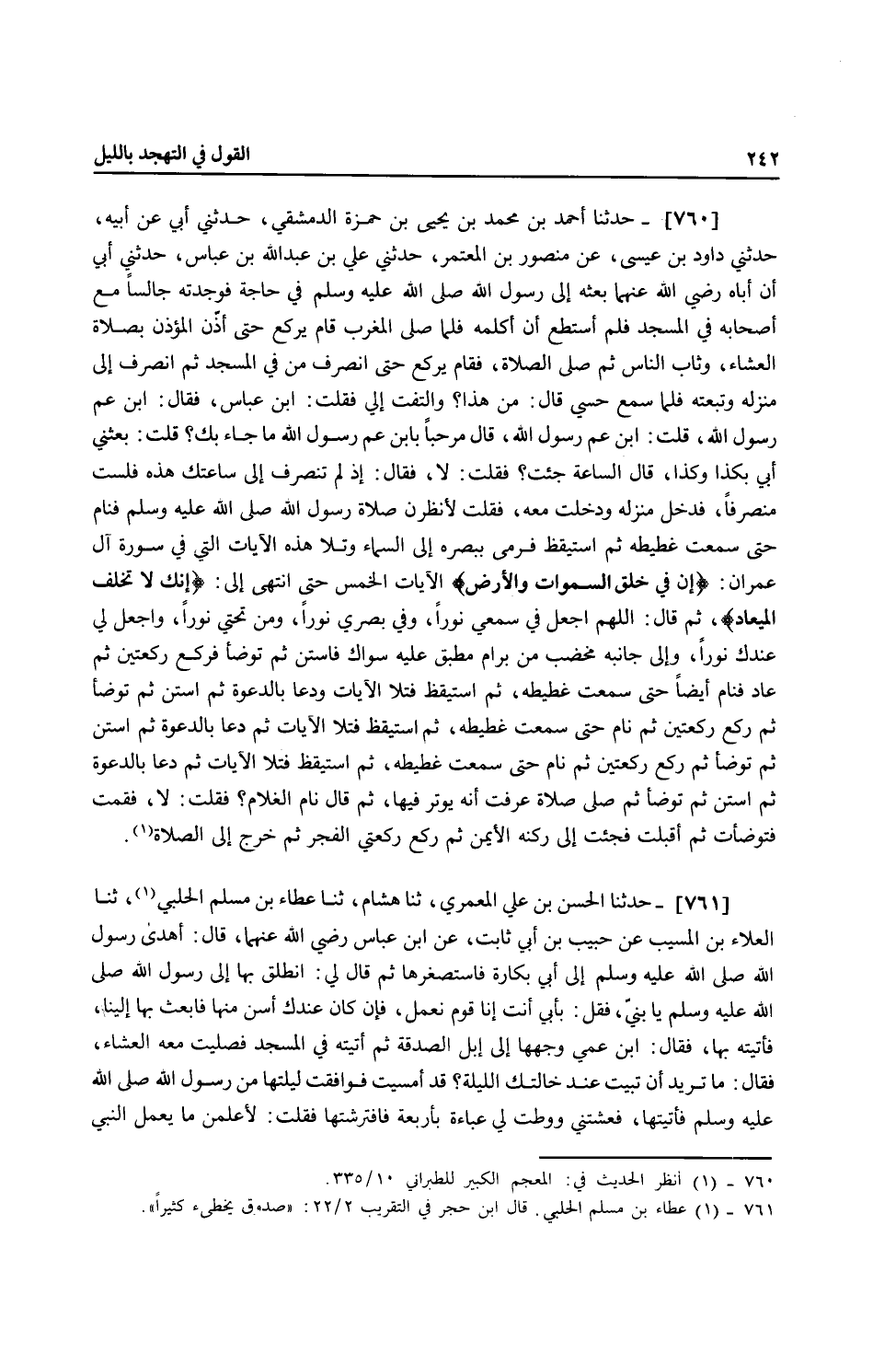 760 - حَدَّثَنَا أَحْمَدُ بْنُ مُحَمَّدِ بْنِ يَحْيَى بْنِ حَمْزَةَ الدِّمَشْقِيُّ، حَدَّثَنِي أَبِي، عَنْ أَبِيهِ، حَدَّثَنِي دَاوُدُ بْنُ عِيسَى، عَنْ مَنْصُورِ بْنِ الْمُعْتَمِرِ، حَدَّثَنِي عَلِيُّ بْنُ عَبْدِ اللَّهِ بْنِ عَبَّاسٍ، حَدَّثَنِي أَبِي أَنَّ أَبَاهُ، رَضِيَ اللَّهُ عَنْهُمَا بَعَثَهُ إِلَى رَسُولِ اللَّهِ صَلَّى اللهُ عَلَيْهِ وَسَلَّمَ فِي حَاجَةٍ فَوَجَدْتُهُ جَالِسًا مَعَ أَصْحَابِهِ فِي الْمَسْجِدِ، فَلَمْ أَسْتَطِعْ أَنْ أُكَلِّمَهُ، فَلَمَّا صَلَّى الْمَغْرِبَ قَامَ يَرْكَعُ حَتَّى أَذَّنَ الْمُؤَذِّنُ بِصَلَاةِ الْعِشَاءِ وَثَابَ النَّاسُ، ثُمَّ صَلَّى الصَّلَاةَ فَقَامَ يَرْكَعُ حَتَّى انْصَرَفَ مَنْ فِي الْمَسْجِدِ، ثُمَّ انْصَرَفَ إِلَى مَنْزِلِهِ وَتَبِعْتُهُ فَلَمَّا سَمِعَ حِسِّي قَالَ: «مَنْ هَذَا؟» وَالْتَفَتَ إِلَيَّ، فَقُلْتُ: ابْنُ عَبَّاسٍ، فَقَالَ: «ابْنُ عَمِّ رَسُولِ اللَّهِ؟» قُلْتُ: ابْنُ عَمِّ رَسُولِ اللَّهِ، قَالَ: «مَرْحَبًا بِابْنِ عَمِّ رَسُولِ اللَّهِ، مَا جَاءَ بِكَ؟» قُلْتُ: بَعَثَنِي أَبِي بِكَذَا وَكَذَا، قَالَ: «السَّاعَةَ جِئْتَ؟» فَقُلْتُ: لَا، فَقَالَ: «إِذْ لَمْ تَنْصَرِفْ إِلَى سَاعَتِكَ هَذِهِ فَلَسْتَ مُنْصَرِفًا» فَدَخَلَ مَنْزِلَهُ وَدَخَلْتُ مَعَهُ فَقُلْتُ: لَأَنْظُرَنَّ صَلَاةَ رَسُولِ اللَّهِ صَلَّى اللهُ عَلَيْهِ وَسَلَّمَ، فَنَامَ حَتَّى سَمِعْتُ غَطِيطَهُ، ثُمَّ اسْتَيْقَظَ فَرَمَى بِبَصَرِهِ إِلَى السَّمَاءِ وَتَلَا هَذِهِ الْآيَاتِ الَّتِي فِي سُورَةِ آلِ عِمْرَانَ {إِنَّ فِي خَلْقِ السَّمَوَاتِ وَالْأَرْضِ} الْآيَاتِ الْخَمْسَ حَتَّى انْتَهَى إِلَى {إِنَّكَ لَا تُخْلِفُ الْمِيعَادَ} [آل عمران: 194] ثُمَّ قَالَ: «§اللَّهُمَّ اجْعَلْ فِي سَمْعِي نُورًا، وَفِي بَصَرِي نُورًا، وَمِنْ تَحْتِي نُورًا، وَاجْعَلْ لِي عِنْدَكَ نُورًا» وَإِلَى جَانِبِهِ مِخْضَبٌ مِنْ بِرَامِ مُطْبَقٌ عَلَيْهِ سِوَاكٌ فَاسْتَنَّ ثُمَّ تَوَضَّأَ، فَرَكَعَ رَكْعَتَيْنِ ثُمَّ عَادَ فَنَامَ أَيْضًا حَتَّى سَمِعْتُ غَطِيطَهُ، ثُمَّ اسْتَيْقَظَ فَتَلَا الْآيَاتِ، وَدَعَا بِالدَّعْوَةِ ثُمَّ اسْتَنَّ ثُمَّ تَوَضَّأَ، ثُمَّ رَكَعَ رَكْعَتَيْنِ ثُمَّ نَامَ حَتَّى سَمِعْتُ غَطِيطَهُ ثُمَّ اسْتَيْقَظَ فَتَلَا الْآيَاتِ ثُمَّ دَعَا بِالدَّعْوَةِ، ثُمَّ اسْتَنَّ ثُمَّ تَوَضَّأَ، ثُمَّ رَكَعَ رَكْعَتَيْنِ ثُمَّ نَامَ حَتَّى سَمِعْتُ غَطِيطَهُ، ثُمَّ اسْتَيْقَظَ فَتَلَا الْآيَاتِ ثُمَّ دَعَا بِالدَّعْوَةِ ثُمَّ اسْتَنَّ ثُمَّ تَوَضَّأَ ثُمَّ صَلَّى صَلَاةً عَرَفْتُ أَنَّهُ يُوتِرُ فِيهَا، ثُمَّ قَالَ: «نَامَ الْغُلَامُ؟» فَقُلْتُ: لَا، فَقُمْتُ فَتَوَضَّأْتُ ثُمَّ أَقْبَلْتُ فَجِئْتُ إِلَى رُكْنِهِ الْأَيْمَنِ، ثُمَّ رَكَعَ رَكْعَتَيِ الْفَجْرِ ثُمَّ خَرَجَ إِلَى الصَّلَاةِ