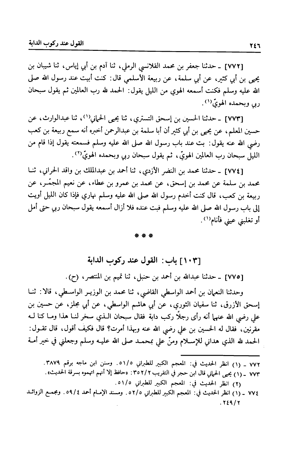 775 - حَدَّثَنَا عَبْدُ اللَّهِ بْنُ أَحْمَدَ بْنِ حَنْبَلٍ، ثنا تَمِيمُ بْنُ الْمُنْتَصِرِ، ح وَحَدَّثَنَا النُّعْمَانُ بْنُ أَحْمَدَ الْوَاسِطِيُّ الْقَاضِي، ثنا مُحَمَّدُ بْنُ الْوَزِيرِ الْوَاسِطِيُّ، قَالَا: ثنا إِسْحَاقُ الْأَزْرَقُ، ثنا سُفْيَانُ الثَّوْرِيُّ، عَنْ أَبِي هَاشِمٍ الْوَاسِطِيِّ، عَنْ أَبِي مِجْلَزٍ، عَنْ حُسَيْنِ بْنِ عَلِيٍّ، رَضِيَ اللَّهُ عَنْهُمَا أَنَّهُ رَأَى رَجُلًا رَكِبَ دَابَّةً فَقَالَ: سُبْحَانَ الَّذِي سَخَّرَ لَنَا هَذَا وَمَا كُنَّا لَهُ مُقْرِنِينَ، فَقَالَ لَهُ الْحُسَيْنُ بْنُ عَلِيٍّ رَضِيَ اللَّهُ عَنْهُ: «وَبِهَذَا أُمِرْتَ؟» قَالَ: فَكَيْفَ أَقُولُ؟ قَالَ: «تَقُولُ §الْحَمْدُ لِلَّهِ الَّذِي هَدَانِي لِلْإِسْلَامِ وَمَنَّ عَلَيَّ بِمُحَمَّدٍ صَلَّى اللهُ عَلَيْهِ وَسَلَّمَ وَجَعَلَنِي فِي خَيْرِ أُمَّةٍ -[247]- أُخْرِجَتْ لِلنَّاسِ» ، فَهَذِهِ النِّعْمَةُ، فَقَالَ: " تَبْدَأُ بِهَذَا لِقَوْلِهِ عَزَّ وَجَلَّ: {ثُمَّ تَذْكُرُوا نِعْمَةَ رَبِّكُمْ إِذَا اسْتَوَيْتُمْ عَلَيْهِ وَتَقُولُوا سُبْحَانَ الَّذِي سَخَّرَ لَنَا هَذَا وَمَا كُنَّا لَهُ مُقْرِنِينَ} [الزخرف: 13] "