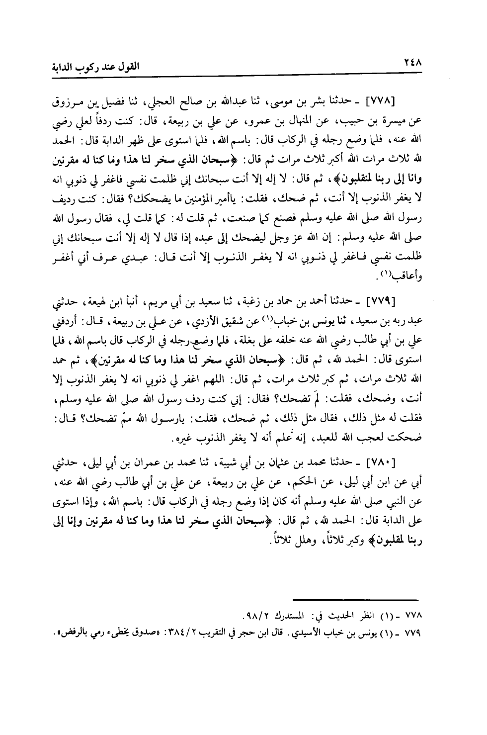 778 - حَدَّثَنَا بِشْرُ بْنُ مُوسَى، ثنا عَبْدُ اللَّهِ بْنُ صَالِحٍ الْعِجْلِيُّ، ثنا فُضَيْلُ بْنُ مَرْزُوقٍ، عَنْ مَيْسَرَةَ بْنِ حَبِيبٍ، عَنِ الْمِنْهَالِ بْنِ عَمْرٍو، عَنْ عَلِيِّ بْنِ رَبِيعَةَ، قَالَ: كُنْتُ رِدْفًا لِعَلِيٍّ رَضِيَ اللَّهُ عَنْهُ، فَلَمَّا وَضَعَ رِجْلَهُ فِي الرِّكَابِ قَالَ: بِسْمِ اللَّهِ، فَلَمَّا اسْتَوَى عَلَى ظَهْرِ الدَّابَّةِ قَالَ: الْحَمْدُ لِلَّهِ ثَلَاثَ مَرَّاتٍ اللَّهُ أَكْبَرُ ثَلَاثَ مَرَّاتٍ، ثُمَّ قَالَ: {سُبْحَانَ الَّذِي سَخَّرَ لَنَا هَذَا وَمَا كُنَّا لَهُ مُقْرِنِينَ وَإِنَّا إِلَى رَبِّنَا لَمُنْقَلِبُونَ} [الزخرف: 14] ثُمَّ قَالَ: لَا إِلَهَ إِلَّا أَنْتَ سُبْحَانَكَ إِنِّي ظَلَمْتُ نَفْسِي فَاغْفِرْ لِي ذُنُوبِي، إِنَّهُ لَا يَغْفِرُ الذُّنُوبَ إِلَّا أَنْتَ، ثُمَّ ضَحِكَ، فَقُلْتُ: يَا أَمِيرَ الْمُؤْمِنِينَ مَا يُضْحِكُكَ؟ فَقَالَ: كُنْتُ رَدِيفَ رَسُولِ اللَّهِ صَلَّى اللهُ عَلَيْهِ وَسَلَّمَ فَصَنَعَ كَمَا صَنَعْتُ، ثُمَّ قُلْتُ لَهُ كَمَا قُلْتَ لِي، فَقَالَ رَسُولُ اللَّهِ صَلَّى اللهُ عَلَيْهِ وَسَلَّمَ: إِنَّ اللَّهَ عَزَّ وَجَلَّ لَيَضْحَكُ إِلَى عَبْدِهِ إِذَا قَالَ: لَا إِلَهَ إِلَّا أَنْتَ سُبْحَانَكَ إِنِّي ظَلَمْتُ نَفْسِي، فَاغْفِرْ لِي ذُنُوبِي إِنَّهُ لَا يَغْفِرُ الذُّنُوبَ إِلَّا أَنْتَ، قَالَ: «§عَبْدِي عَرَفَ أَنِّي أَغْفِرُ وَأُعَاقِبُ»