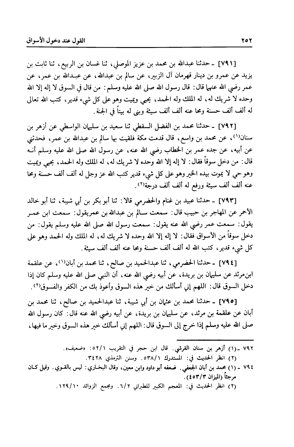 792 - حَدَّثَنَا مُحَمَّدُ بْنُ الْفَضْلِ السَّقَطِيُّ، ثنا سَعِيدُ بْنُ سُلَيْمَانَ الْوَاسِطِيُّ، عَنْ أَزْهَرَ بْنِ سِنَانٍ، عَنْ مُحَمَّدِ بْنِ وَاسِعٍ، قَالَ: قَدِمْتُ مَكَّةَ فَلَقِيتُ بِهَا سَالِمَ بْنَ عَبْدِ اللَّهِ بْنِ عُمَرَ، فَحَدَّثَنِي عَنُ أَبِيهِ عَنْ جَدِّهِ عُمَرَ بْنِ الْخَطَّابِ رَضِيَ اللَّهُ عَنْهُ عَنْ رَسُولِ اللَّهِ صَلَّى اللهُ عَلَيْهِ وَسَلَّمَ أَنَّهُ قَالَ: " §مَنْ دَخَلَ سُوقًا فَقَالَ: لَا إِلَهَ إِلَّا اللَّهُ وَحْدَهُ لَا شَرِيكَ لَهُ، لَهُ الْمُلْكُ وَلَهُ الْحَمْدُ يُحْيِي وَيُمِيتُ وَهُوَ حَيُّ لَا يَمُوتُ، بِيَدِهِ الْخَيْرُ وَهُوَ عَلَى كُلِّ شَيْءٍ قَدِيرٌ، كَتَبَ اللَّهُ عَزَّ وَجَلَّ لَهُ أَلْفَ أَلْفِ حَسَنَةً، وَمَحَا عَنْهُ أَلْفَ أَلْفِ سَيِّئَةً، وَرَفَعَ لَهُ أَلْفَ أَلْفِ دَرَجَةً "