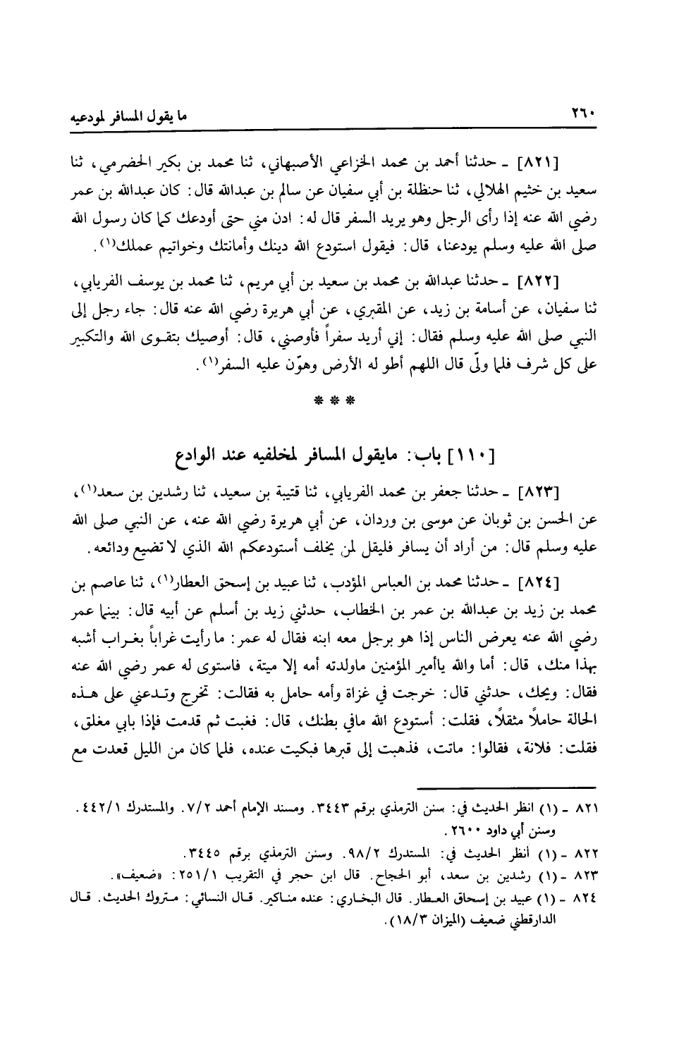 823 - حَدَّثَنَا جَعْفَرُ بْنُ مُحَمَّدٍ الْفِرْيَابِيُّ، ثنا قُتَيْبَةُ بْنُ سَعِيدٍ، ثنا رِشْدِينُ بْنُ سَعْدٍ، عَنِ الْحَسَنِ بْنِ ثَوْبَانَ، عَنْ مُوسَى بْنِ وَرْدَانَ، عَنْ أَبِي هُرَيْرَةَ، رَضِيَ اللَّهُ عَنْهُ عَنِ النَّبِيِّ صَلَّى اللهُ عَلَيْهِ وَسَلَّمَ قَالَ: " §مَنْ أَرَادَ أَنْ يُسَافِرَ فَلْيَقُلْ لِمَنْ يُخَلِّفُ: أَسْتَوْدِعُكُمُ اللَّهَ الَّذِي لَا يُضِيعُ وَدَائِعُهُ "