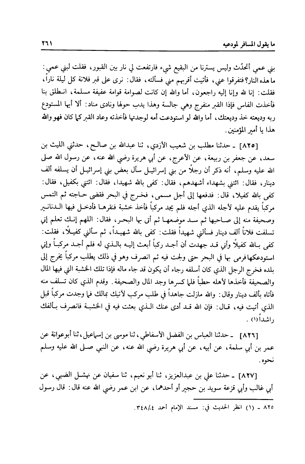 825 - حَدَّثَنَا مُطَّلِبُ بْنُ شُعَيْبٍ الْأَزْدِيُّ، ثنا عَبْدُ اللَّهِ بْنُ صَالِحٍ، حَدَّثَنِي اللَّيْثُ بْنُ سَعْدٍ، عَنْ جَعْفَرِ بْنِ رَبِيعَةَ، عَنِ الْأَعْرَجِ، عَنْ أَبِي هُرَيْرَةَ، رَضِيَ اللَّهُ عَنْهُ عَنْ رَسُولِ اللَّهِ صَلَّى اللهُ عَلَيْهِ وَسَلَّمَ أَنَّهُ " ذَكَرَ أَنَّ §رَجُلًا مِنْ بَنِي إِسْرَائِيلَ سَأَلَ بَعْضَ بَنِي إِسْرَائِيلَ أَنْ يُسْلِفَهُ أَلْفَ دِينَارٍ، فَقَالَ: ائْتِنِي بِشُهَدَاءَ أُشْهِدُهُمْ، فَقَالَ: كَفَى بِاللَّهِ شَهِيدًا، فَقَالَ: ائْتِنِي بِكَفِيلٍ، فَقَالَ: كَفَى بِاللَّهِ كَفِيلًا، قَالَ: فَدَفَعَهَا إِلَى أَجَلٍ مُسَمًّى، فَخَرَجَ فِي الْبَحْرِ فَقَضَى حَاجَتَهُ ثُمَّ الْتَمَسَ مَرْكَبًا يَقْدُمُ عَلَيْهِ لِأَجَلِهِ الَّذِي أَجَّلَهُ، فَلَمْ يَجِدْ مَرْكَبًا فَأَخَذَ خَشَبَةً فَنَقَرَهَا فَأَدْخَلَ فِيهَا الدَّنَانِيرَ وَصَحِيفَةً مِنْهُ إِلَى صَاحِبِهَا ثُمَّ سَدَّ مَوْضِعَهَا، ثُمَّ أَتَى بِهَا الْبَحْرَ، فَقَالَ: اللَّهُمَّ إِنَّكَ تَعْلَمُ أَنِّي تَسَلَّفْتُ فُلَانًا أَلْفَ دِينَارٍ فَسَأَلَنِي شَهِيدًا، فَقُلْتُ: كَفَى بِاللَّهِ شَهِيدًا، ثُمَّ سَأَلَنِي كَفِيلًا، فَقُلْتُ: كَفَى بِاللَّهِ كَفِيلًا، وَإِنِّي قَدْ جَهِدْتُ أَنْ أَجِدَ مَرْكِبًا أَبْعَثُ إِلَيْهِ بِالَّذِي لَهُ، فَلَمْ أَجِدْ مَرْكَبًا، وَإِنِّي أَسْتَوْدِعُكَهَا فَرَمَى بِهَا فِي الْبَحْرِ حَتَّى وَلَجَتْ فِيهِ، ثُمَّ انْصَرَفَ وَهُوَ فِي ذَلِكَ يَطْلُبُ مَرْكَبًا يَخْرُجُ إِلَى بَلَدِهِ، فَخَرَجَ الرَّجُلُ الَّذِي كَانَ أَسْلَفَهُ رَجَاءَ أَنْ يَكُونَ قَدْ جَاءَ مَالُهُ فَإِذَا تِلْكَ الْخَشَبَةُ الَّتِي فِيهَا الْمَالُ وَالصَّحِيفَةُ، فَأَخَذَهَا لِأَهْلِهِ حَطَبًا فَلَمَّا كَسَرَهَا وَجَدَ الْمَالَ وَالصَّحِيفَةَ، وَقَدِمَ الَّذِي كَانَ تَسَلَّفَ مِنْهُ، فَأَتَاهُ بِأَلْفِ دِينَارٍ، وَقَالَ: وَاللَّهِ مَا زِلْتُ جَاهِدًا فِي طَلَبِ مَرْكَبٍ لِآتِيَكَ بِمَالِكَ فَمَا وَجَدْتُ مَرْكَبًا قَبْلَ الَّذِي أَتَيْتُ فِيهِ قَالَ: فَإِنَّ اللَّهَ قَدْ أَدَّى عَنْكَ الَّذِي بُعِثْتَ فِيهِ فِي الْخَشَبَةِ فَانْصَرِفْ بِأَلْفِكَ رَاشِدًا "
