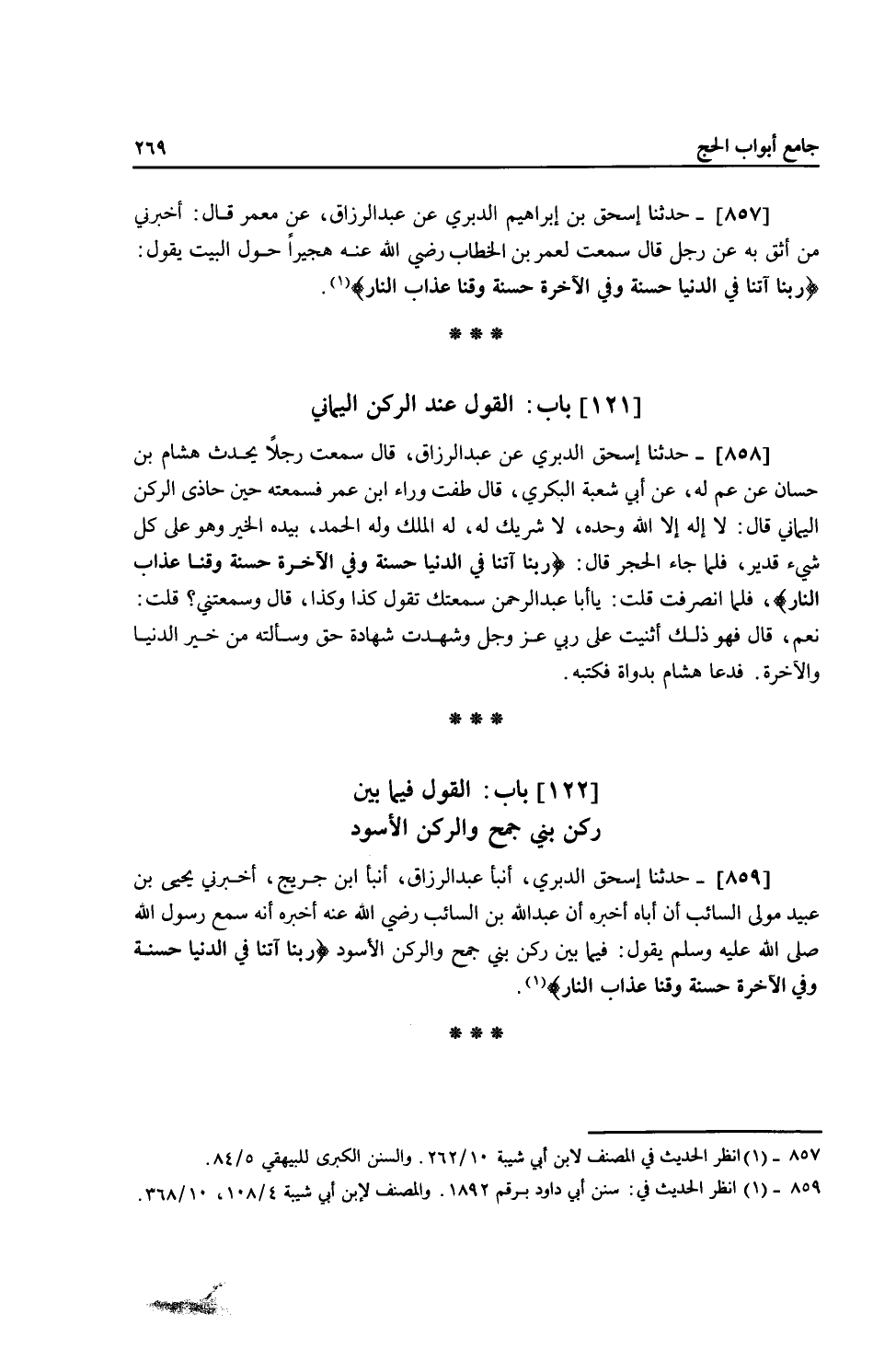 859 - حَدَّثَنَا إِسْحَاقُ الدَّبَرِيُّ، أَنْبَأَ عَبْدُ الرَّزَّاقِ، أَنْبَأَ ابْنُ جُرَيْجٍ، أَخْبَرَنِي يَحْيَى بْنُ عُبَيْدٍ مَوْلَى السَّائِبِ أَنَّ أَبَاهُ أَخْبَرَهُ أَنَّ عَبْدَ اللَّهِ بْنَ السَّائِبِ رَضِيَ اللَّهُ عَنْهُ أَخْبَرَهُ أَنَّهُ سَمِعَ رَسُولَ اللَّهِ صَلَّى اللهُ عَلَيْهِ وَسَلَّمَ يَقُولُ فِيمَا بَيْنَ رُكْنِ بَنِي جُمَحٍ وَالرُّكْنِ الْأَسْوَدِ: " {§رَبَّنَا آتِنَا فِي الدُّنْيَا حَسَنَةً وَفِي الْآخِرَةِ حَسَنَةً وَقِنَا} [البقرة: 201] عَذَابَ النَّارِ "