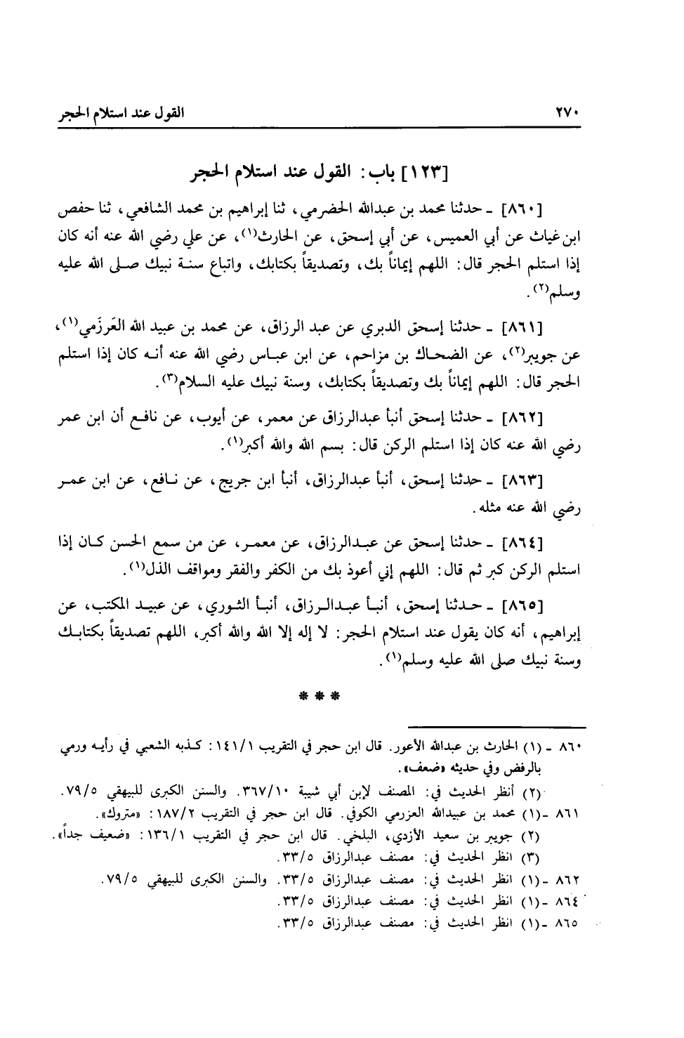 861 - حَدَّثَنَا إِسْحَاقُ الدَّبَرِيُّ، عَنْ عَبْدِ الرَّزَّاقِ، عَنْ مُحَمَّدِ بْنِ عُبَيْدِ اللَّهِ الْعَرْزَمِيِّ، عَنْ جُوَيْبِرٍ، عَنِ الضَّحَّاكِ بْنِ مُزَاحِمٍ، عَنِ ابْنِ عَبَّاسٍ، رَضِيَ اللَّهُ عَنْهُ أَنَّهُ كَانَ §إِذَا اسْتَلَمَ الْحَجَرَ قَالَ: " اللَّهُمَّ إِيمَانًا بِكَ، وَتَصْدِيقًا بِكِتَابِكَ، وَسُنَّةِ نَبِيِّكَ عَلَيْهِ السَّلَامُ