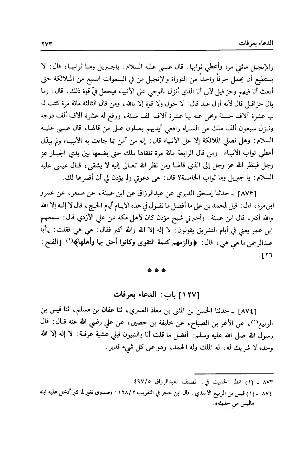 874 - حَدَّثَنَا الْحَسَنُ بْنُ الْمُثَنَّى بْنِ مُعَاذٍ الْعَنْبَرِيُّ، ثنا عَفَّانُ بْنُ مُسْلِمٍ، ثنا قَيْسُ بْنُ الرَّبِيعِ، عَنِ الْأَغَرِّ بْنِ الصَّبَّاحِ، عَنْ خَلِيفَةَ بْنِ حُصَيْنٍ، عَنْ عَلِيٍّ، رَضِيَ اللَّهُ عَنْهُ قَالَ: قَالَ رَسُولُ اللَّهِ صَلَّى اللهُ عَلَيْهِ وَسَلَّمَ: «§أَفْضَلُ مَا قُلْتُ أَنَا وَالنَّبِيُّونَ قَبْلِي عَشِيَّةَ عَرَفَةَ لَا إِلَهَ إِلَّا اللَّهُ وَحْدَهُ، لَا شَرِيكَ لَهُ، لَهُ الْمُلْكُ وَلَهُ الْحَمْدُ، وَهُوَ عَلَى كُلِّ شَيْءٍ قَدِيرٌ»