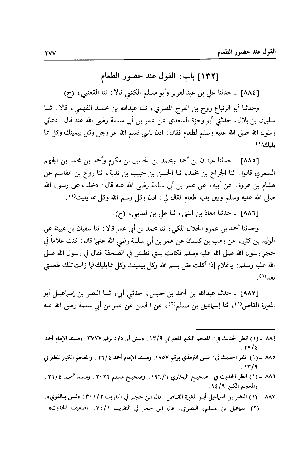 887 - حَدَّثَنَا عَبْدُ اللَّهِ بْنُ أَحْمَدَ بْنِ حَنْبَلٍ، حَدَّثَنِي أَبِي، ثنا النَّضْرُ بْنُ إِسْمَاعِيلَ أَبُو الْمُغِيرَةِ الْقَاصُّ، ثنا إِسْمَاعِيلُ بْنُ مُسْلِمٍ، عَنِ الْحَسَنِ، عَنْ عُمَرَ بْنِ أَبِي سَلَمَةَ، رَضِيَ اللَّهُ عَنْهُ قَالَ: أَقْعَدَنِي رَسُولُ اللَّهِ صَلَّى اللهُ عَلَيْهِ وَسَلَّمَ مَعَهُ عَلَى طَعَامِهِ فَقَالَ لِي: «§سَمِّ اللَّهَ تَعَالَى وَكُلْ بِيَمِينِكَ، وَكُلْ مِمَّا يَلِيكَ»