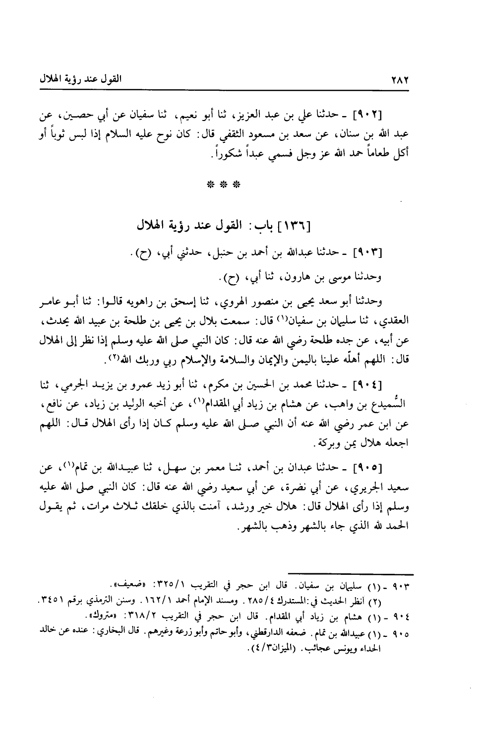 903 - حَدَّثَنَا عَبْدُ اللَّهِ بْنُ أَحْمَدَ بْنِ حَنْبَلٍ، حَدَّثَنِي أَبِي، ح وَحَدَّثَنَا مُوسَى بْنُ هَارُونَ، ثنا أَبِي، ح وَحَدَّثَنَا أَبُو سَعْدٍ يَحْيَى بْنُ مَنْصُورٍ الْهَرَوِيُّ، ثنا إِسْحَاقُ بْنُ رَاهَوَيْهِ، قَالُوا: ثنا أَبُو عَامِرٍ الْعَقَدِيُّ، ثنا سُلَيْمَانُ بْنُ سُفْيَانَ، قَالَ: سَمِعْتُ بِلَالَ بْنَ يَحْيَى بْنِ طَلْحَةَ بْنِ عُبَيْدِ اللَّهِ، يُحَدِّثُ عَنْ أَبِيهِ، عَنْ جَدِّهِ طَلْحَةَ رَضِيَ اللَّهُ عَنْهُ قَالَ: كَانَ النَّبِيُّ صَلَّى اللهُ عَلَيْهِ وَسَلَّمَ §إِذَا نَظَرَ إِلَى الْهِلَالِ قَالَ: «اللَّهُمَّ أَهِلَّهُ عَلَيْنَا بِالْيُمْنِ وَالْإِيمَانِ، وَالسَّلَامَةِ وَالْإِسْلَامِ، رَبِّي وَرَبُّكَ اللَّهُ»